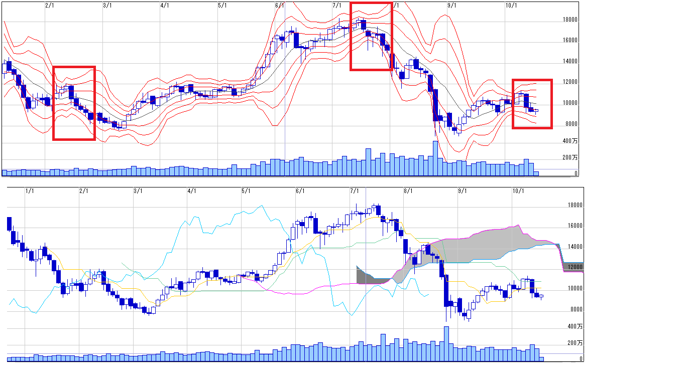 特に、週足転換線は過去何度か抑えられてるので、重要な上値抵抗ポイントと考えてます。