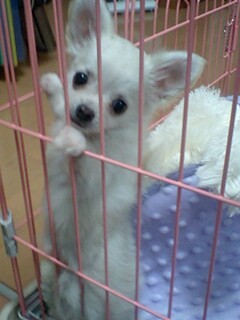真っ白なチワワ犬。名前は『マシュ』に決定!子供が言うにはなんでも、マシュマロみたいに白いから...だそうです。