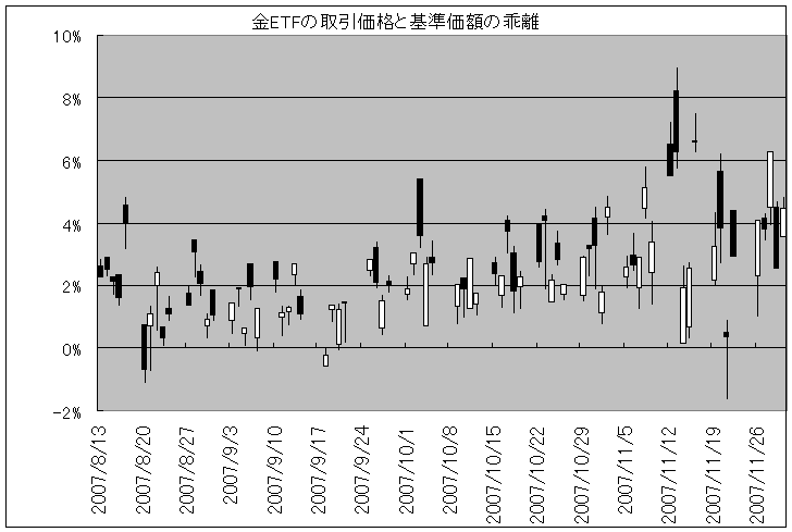 2007/12/02 - miyakenさんの株式ブログ。タイトル:「金ETFの基準価額と取引値の乖離」 本文:金連動ETFの基準価額は、前日のロンドン金価格と為替レートを元にして計算されています。 http://www.ose.or.jp/stocks/data_etf/index_1328.xls