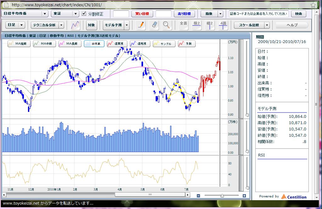 2010/07/17 - Newジェントルマンさんの株式ブログ。タイトル:「こんな予測チャートがありました」 本文:東洋経済がデータマイニングで予測したチャートです。 当たる確率は低いですが、総弱気になると上がるという例として紹介しておきましょう。