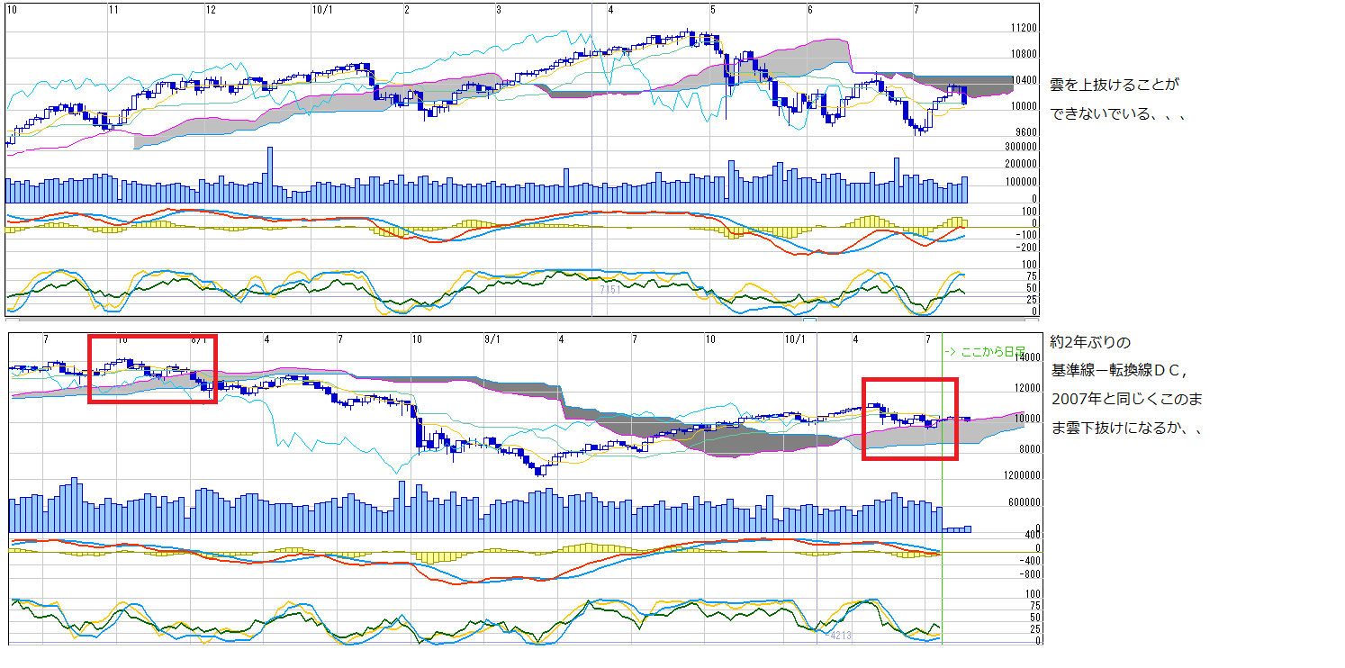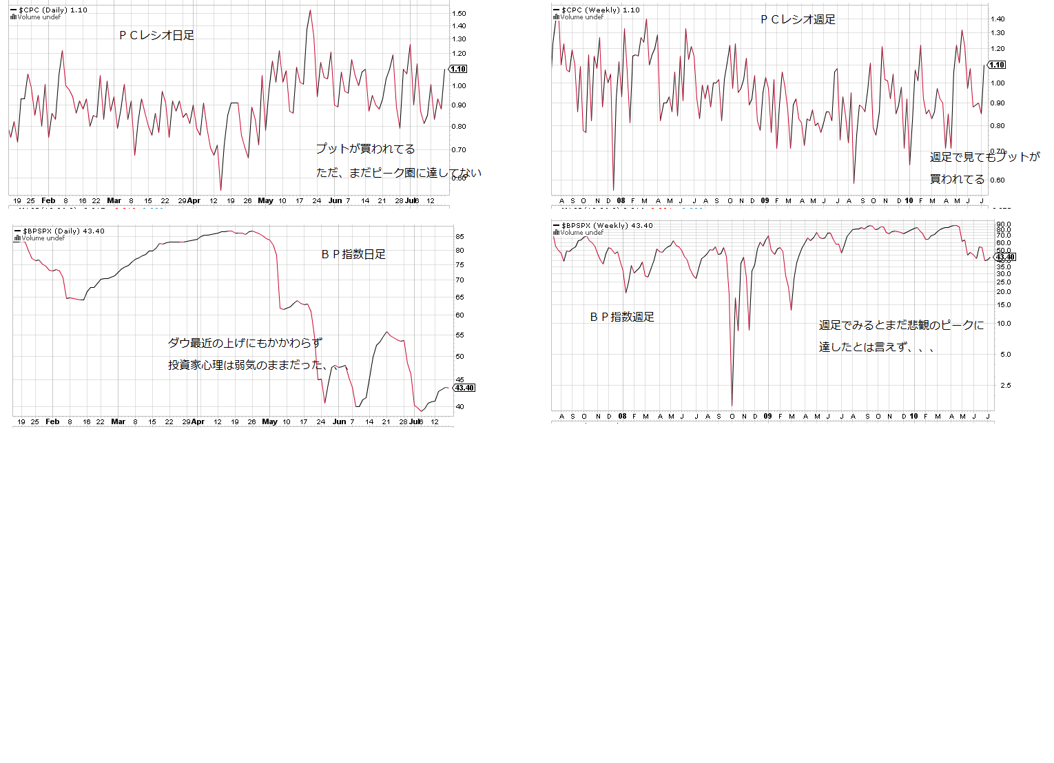2010/07/19 - 月とスッポンさんの株式ブログ。タイトル:「来週のチャートポイント☆NY②」 本文:1 ダウ一目 2 ダウ月足 3.PCレシオ、ブルベアレシオ 投資家心理を読むための指標 PCレシオについてはこちら