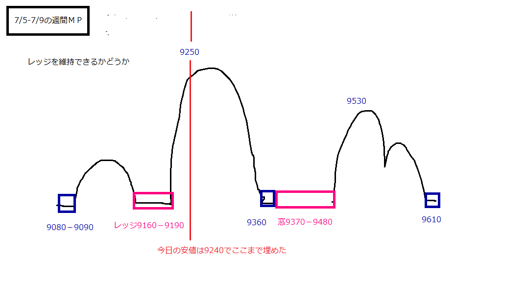 2010/07/20 - 月とスッポンさんの株式ブログ。タイトル:「7/20本日のチャート①」 本文:1.本日のMP 2 先週のMP 3 先々週のMP 下値の参考に 9160-9190のレッジを埋めるかどうか注目