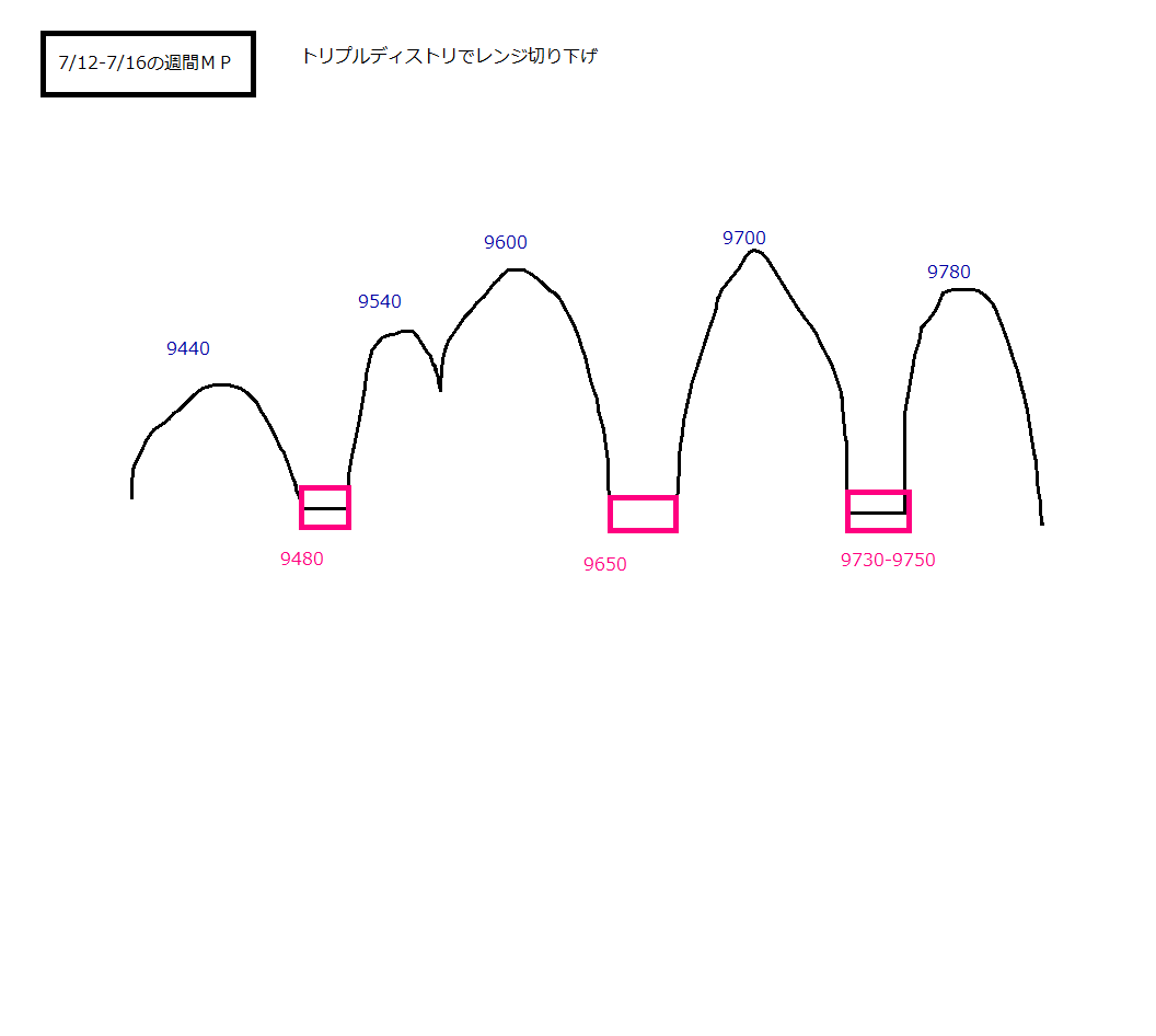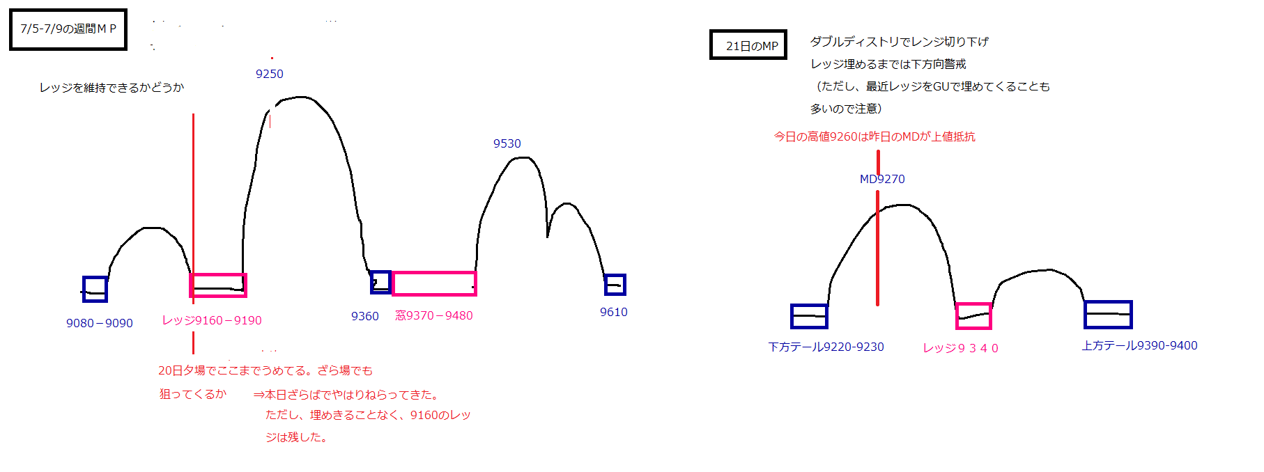 2010/07/22 - 月とスッポンさんの株式ブログ。タイトル:「7/22本日のチャート①」 本文:1、本日のMP 2、先週のMP 上値の参考に 3.先々週のMPと昨日のMP 今日の安値はレッジ9160を残してぎりぎりセーフ。