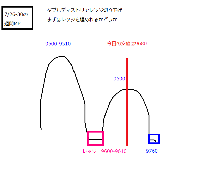 2010/08/02 - 月とスッポンさんの株式ブログ。タイトル:「8/2 本日のチャート①」 本文:1.本日のMP 2.先週のMP 9600-9610のレッジをうめたので、DD否定でレンジ切り下げも否定され、元のレンジに戻った。 ただ、今日の高値9680は上の山9690で押さえられた。