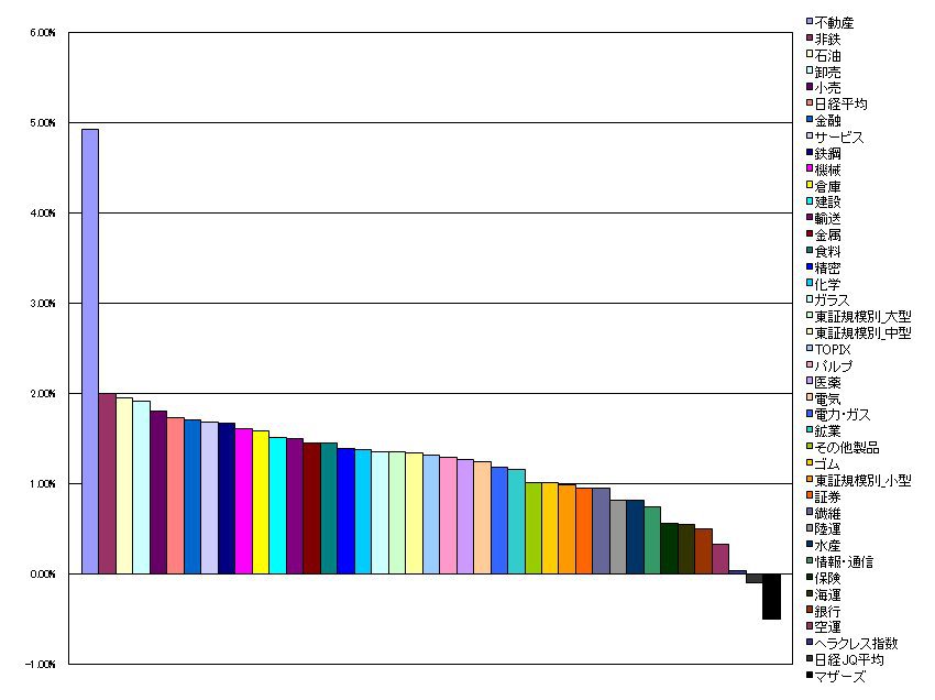 2010/08/05 - tetsuさんの株式ブログ。タイトル:「指数・業種別騰落ランキング」 本文:1.不動産 4.93%(-1.34%) 2.非鉄 2.00%(-1.02%) 3.石油 1.95%(-0.93%) 4.卸売 1.92%(-1.20%) 5.小売 1.81%(-1.03%)
