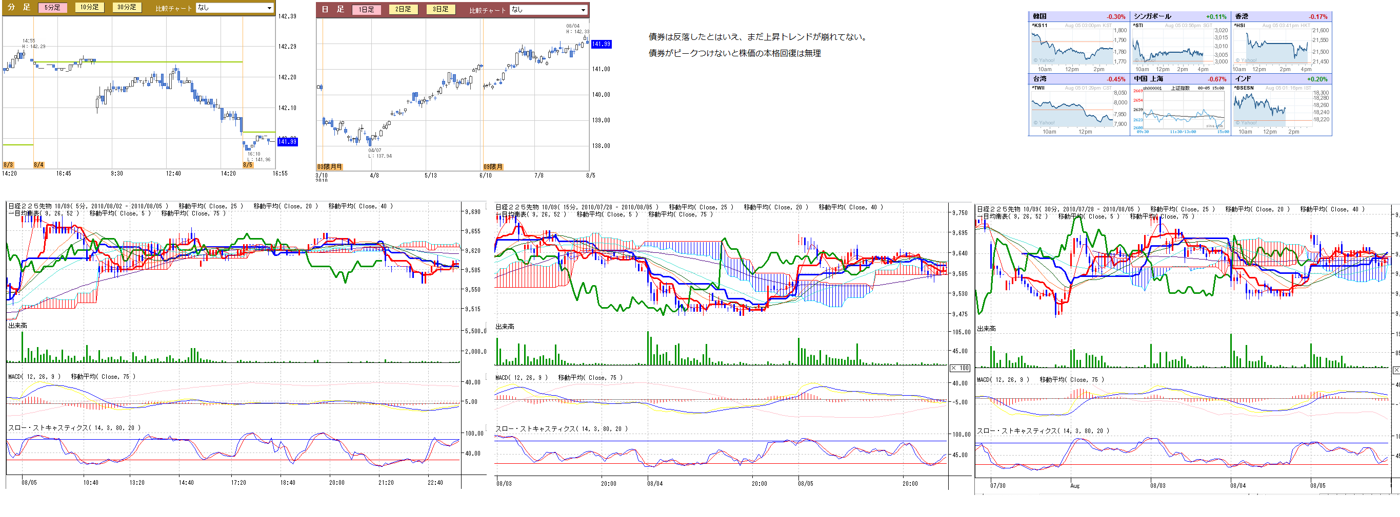 2010/08/05 - 月とスッポンさんの株式ブログ。タイトル:「8/5 本日のチャート②」 本文:画像 分足と債券の記録(夕場終了後にアップします) ☆気になるニュース ・米緩和観測の波紋