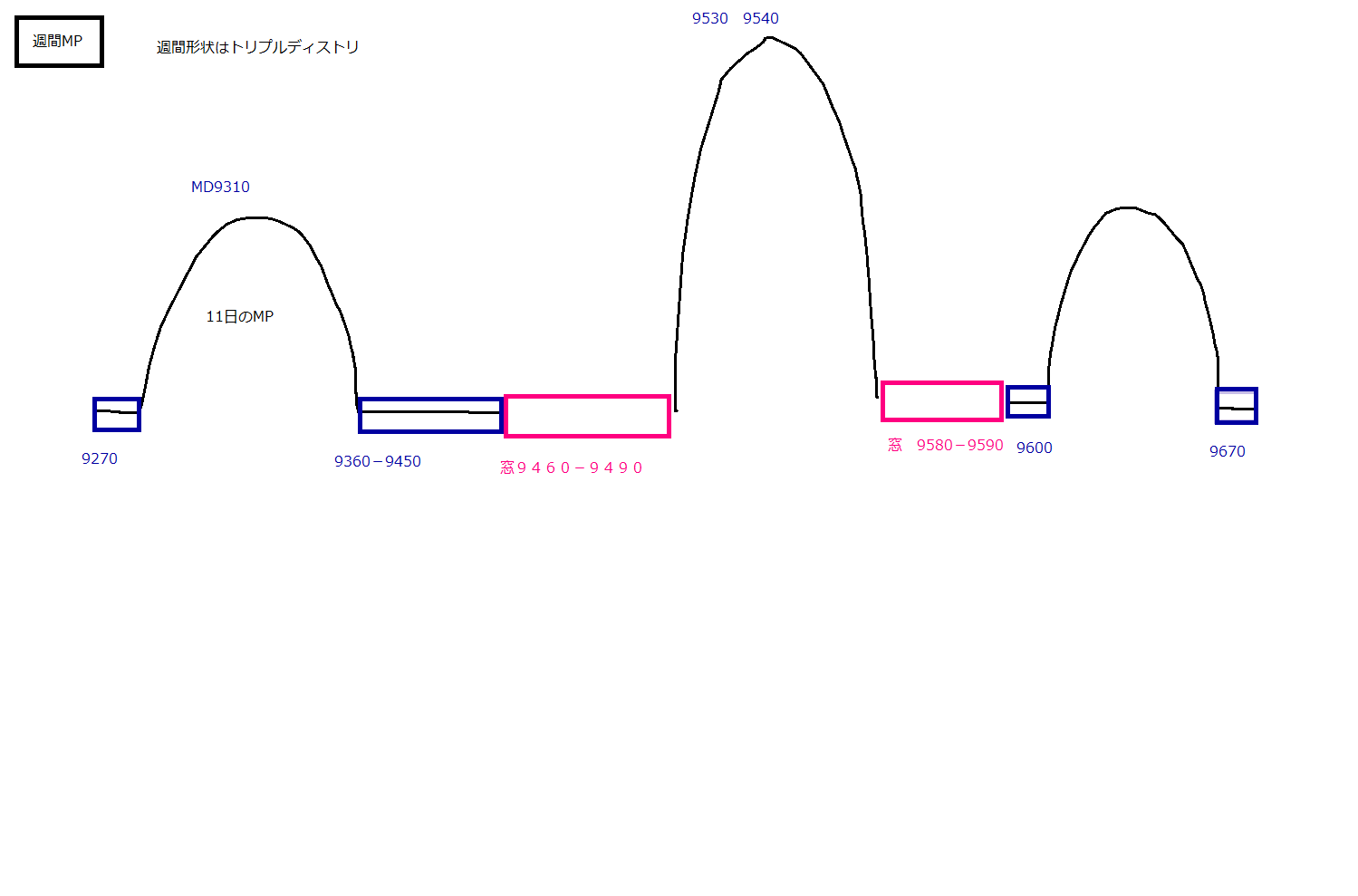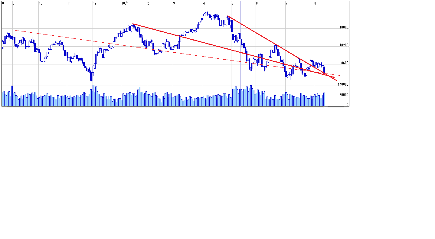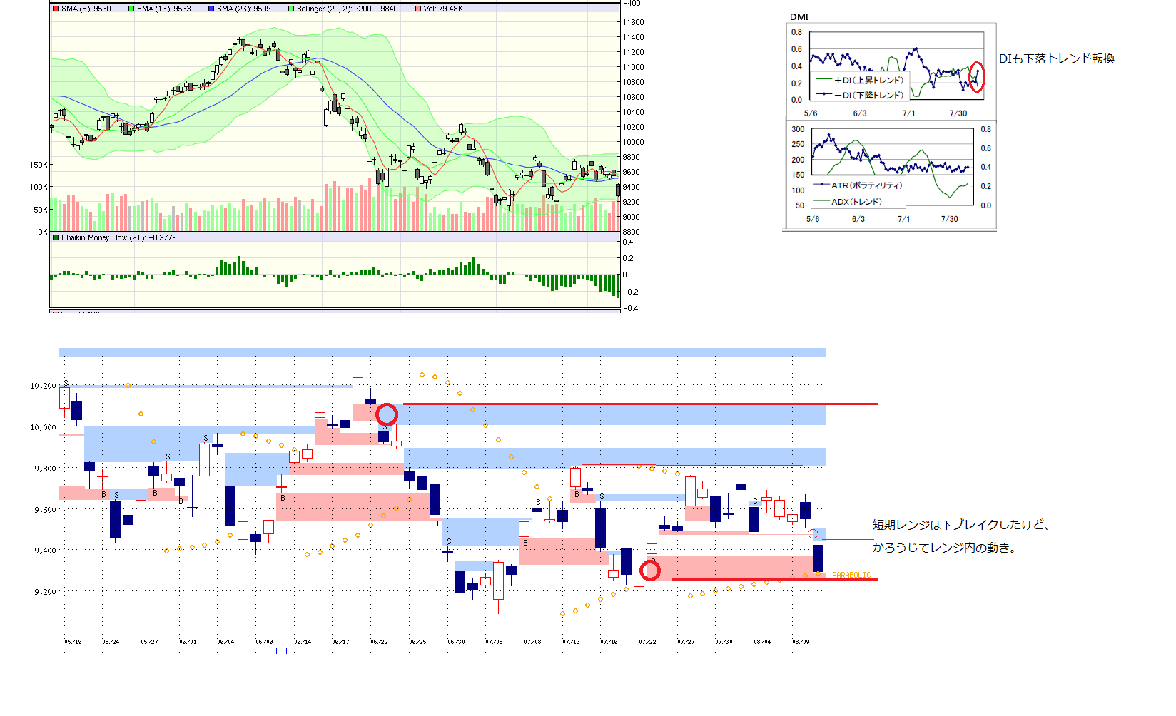 2010/08/11 - 月とスッポンさんの株式ブログ。タイトル:「8/11 本日のチャート①」 本文:1.本日のMPと週間MP 週間形状はトリプルディストリで厳しいです 2.DMI、CMF,窓 3.今日の下値支持ライン 詳しいトレンドラインはこちらを参照