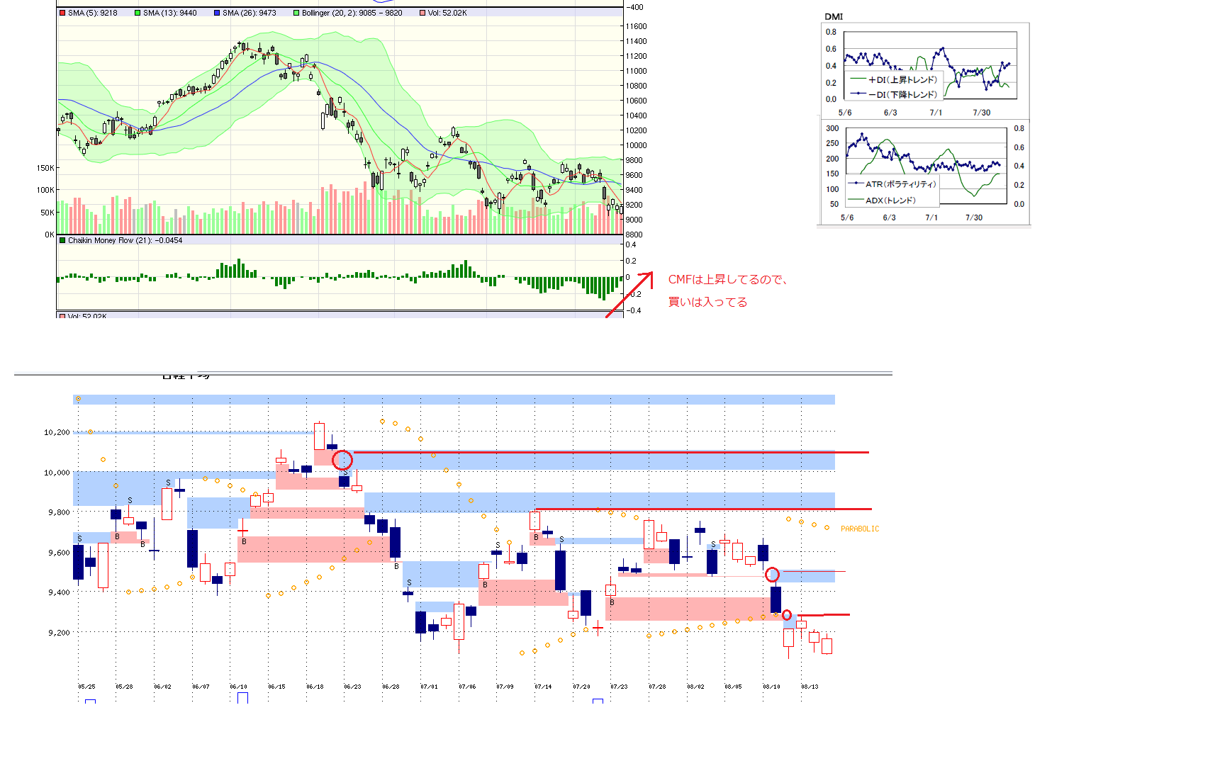2010/08/17 - 月とスッポンさんの株式ブログ。タイトル:「8/17 本日のチャート①」 本文:1.今日のMPと週間MP 2.先週の週間MP 3.DMI、CMF,窓