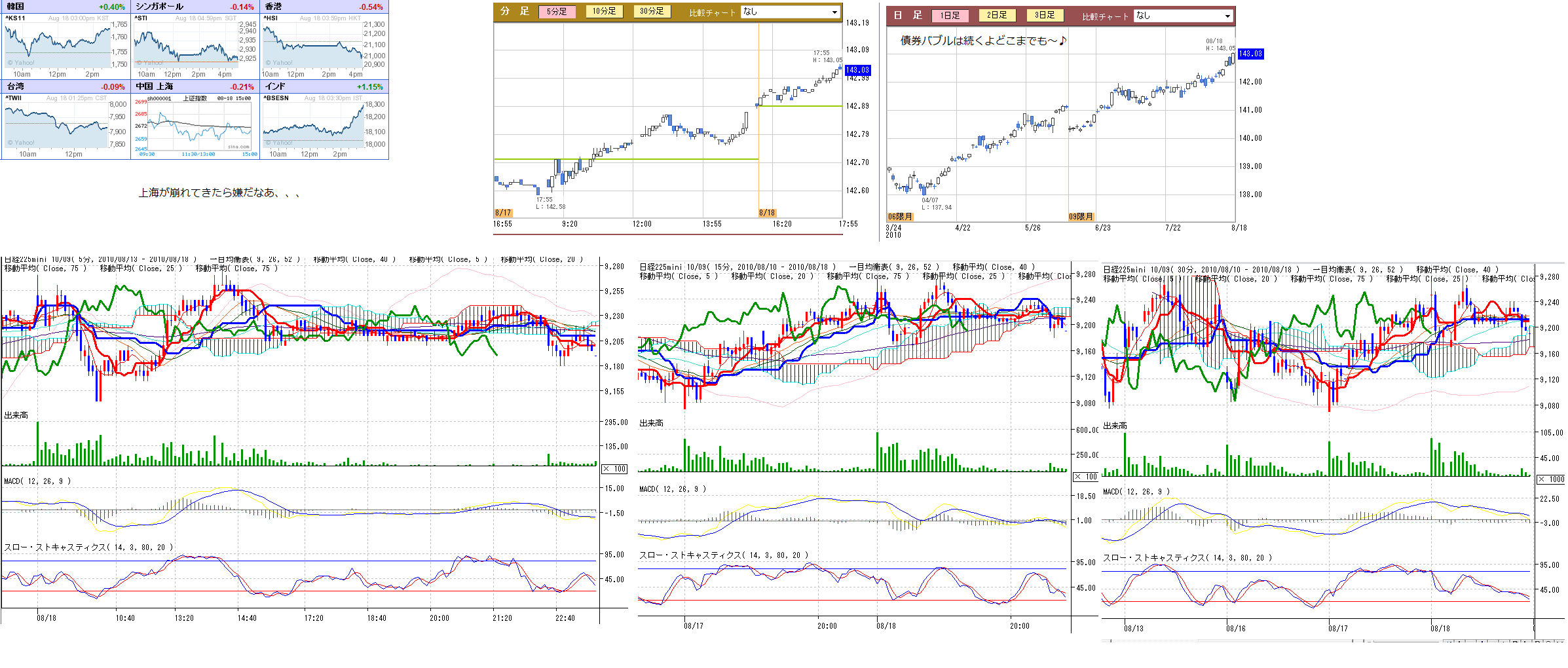 2010/08/18 - 月とスッポンさんの株式ブログ。タイトル:「8/18 本日のチャート②」 本文:画像 債券と分足の記録(夕場終了後にアップします) ☆気になるニュース 円高に対する要人発言あいつぐ ・日銀、円高を過度に警戒せず