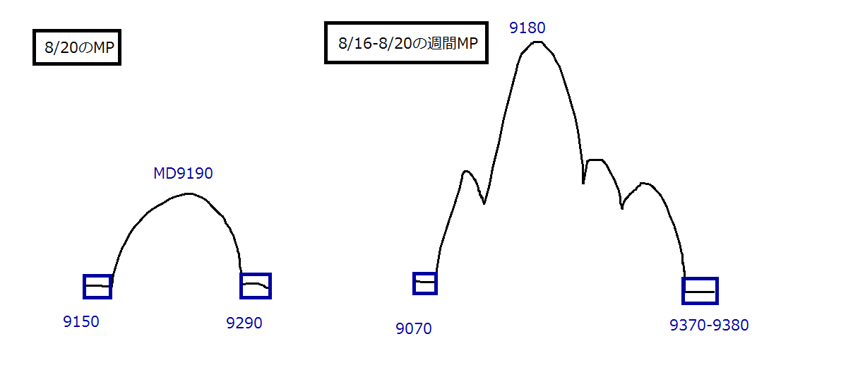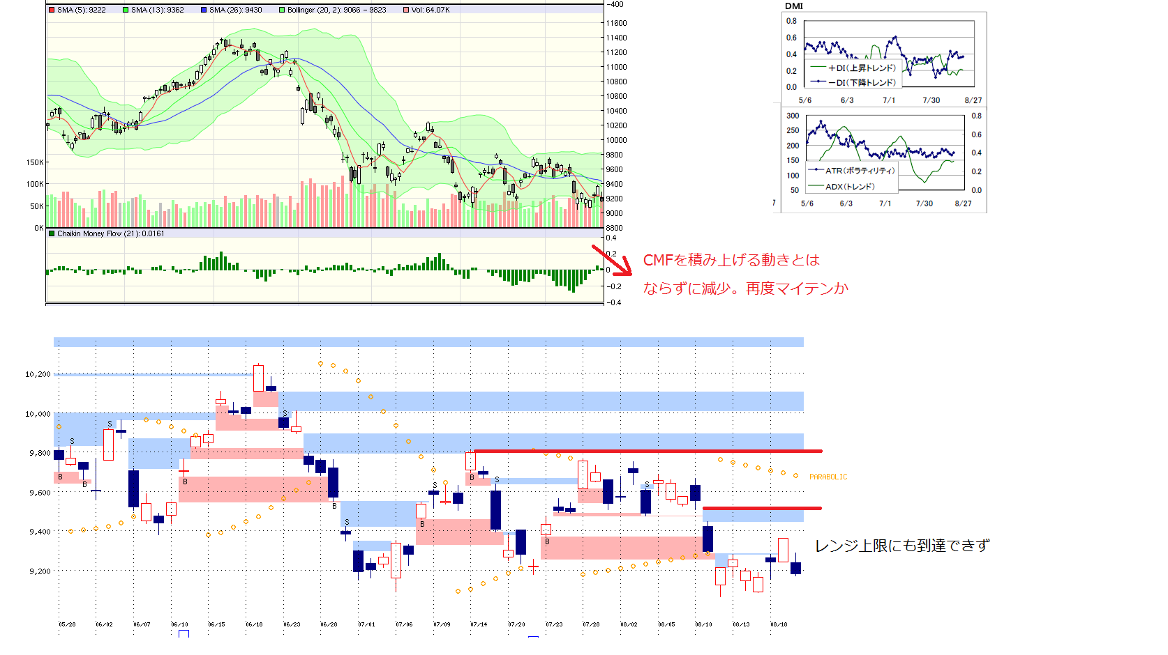 2010/08/20 - 月とスッポンさんの株式ブログ。タイトル:「8/20 本日のチャート①」 本文:1.MP 9180維持できるかどうかがポイントかな、、、 2、先週のMP 3.CMF,DMI,窓