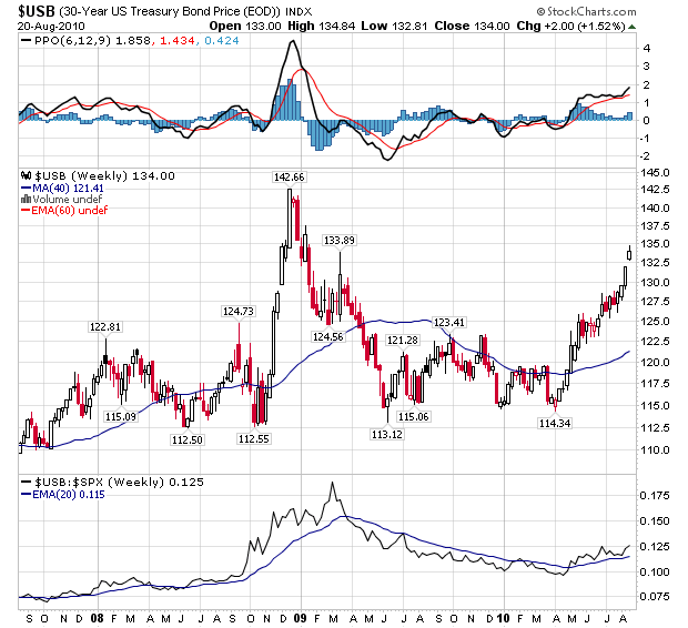 2010/08/22 - Newジェントルマンさんの株式ブログ。タイトル:「国債バブル」 本文:米国の30年物国債のチャート どう見てもバブル。 今、世界中の国債が同じ状況なのだろう。 国債に資金を集中させ空売りする作戦だろう。 国債安・株安はきついよ。