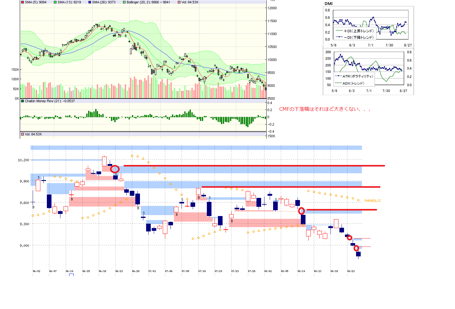 2010/08/25 - 月とスッポンさんの株式ブログ。タイトル:「8/25 本日のチャート①」 本文:1、MP 2、先週のMP 3.CMF,DMI,窓