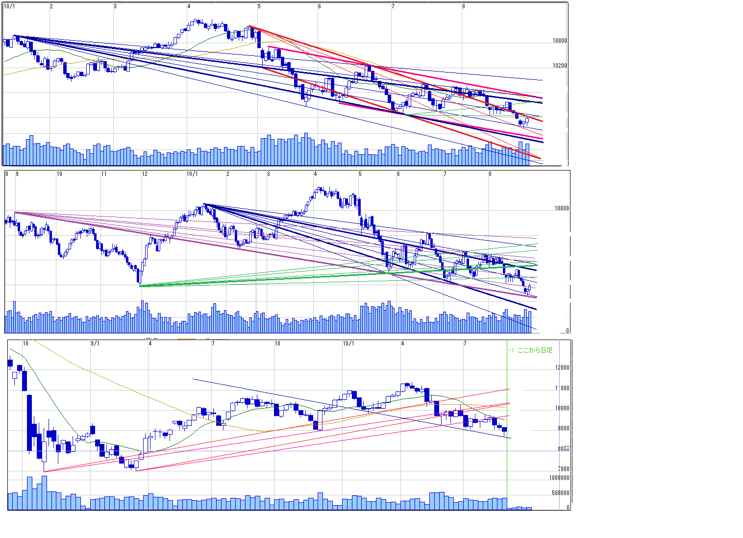 2010/08/29 - 月とスッポンさんの株式ブログ。タイトル:「8/30~ 来週のチャートポイント①」 本文:すみませんが、画像だけ、、、 1.先物トレンドライン、ファンライン 2.日経ドル建て