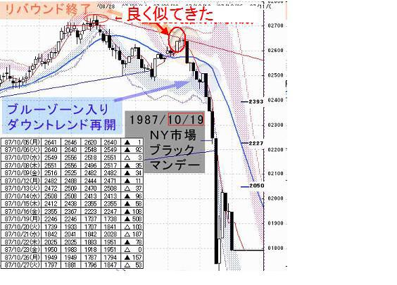 2010/09/04 - Newジェントルマンさんの株式ブログ。タイトル:「1987年と良く似てきた」 本文:1987年のブラックマンデー時の波動と似てきた。 上値抵抗線をブレイクできるか?