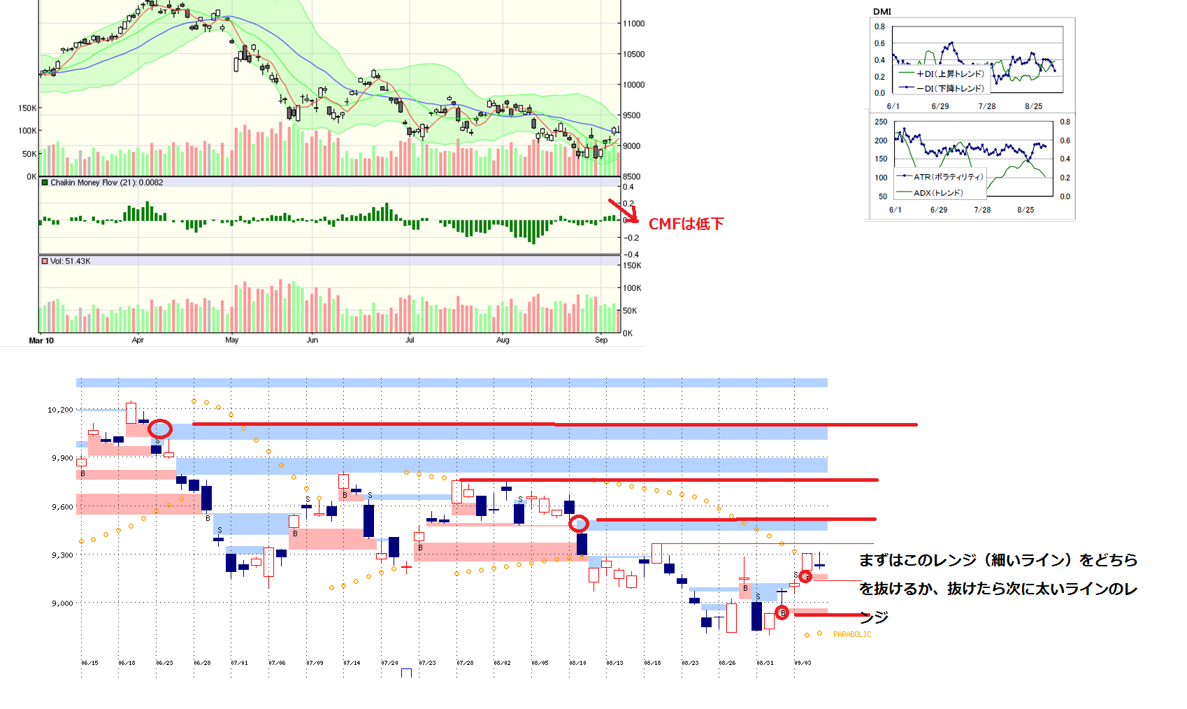 2010/09/07 - 月とスッポンさんの株式ブログ。タイトル:「9/7 本日のチャート①」 本文:1、MP 2、先週のMP 3.CMF,DMI,窓 ☆相場雑感 ・米休場の日って、動かないだろうな~