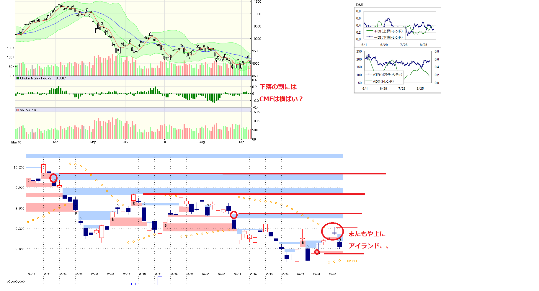 2010/09/08 - 月とスッポンさんの株式ブログ。タイトル:「9/8 本日のチャート①」 本文:1、週間MP 2.先週の週間MPと先週金曜のMP →今日は先週金曜のMPのMD9090をポイントとして考えた。 ここを下抜けるなら9000割れ再度試すかな~と 3、CMF,DMI,窓