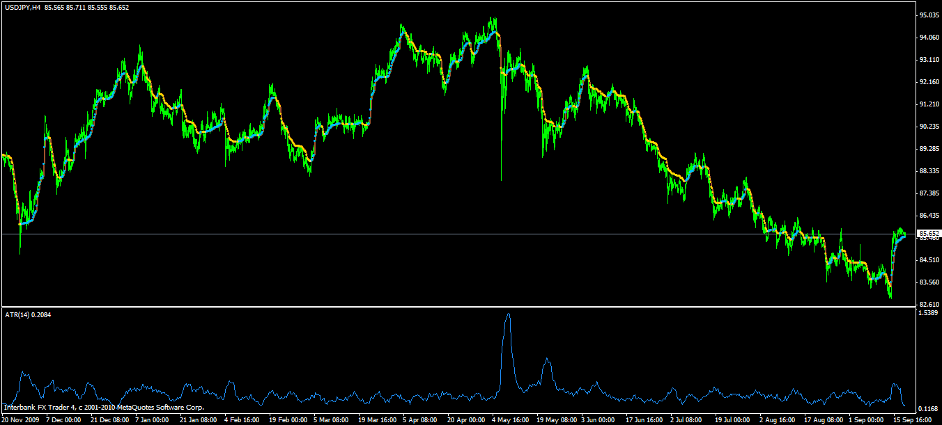 4時間足のATR(14)は20付近ですので、オシレーター的な見方をすると
