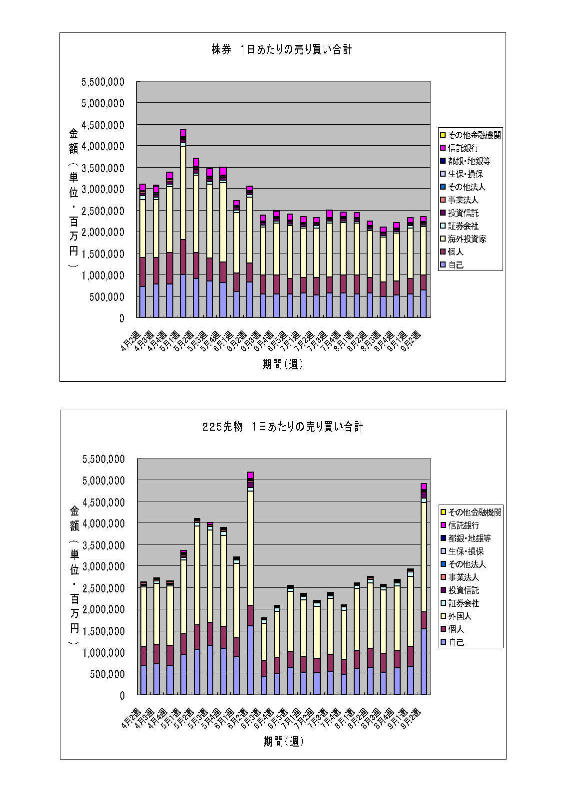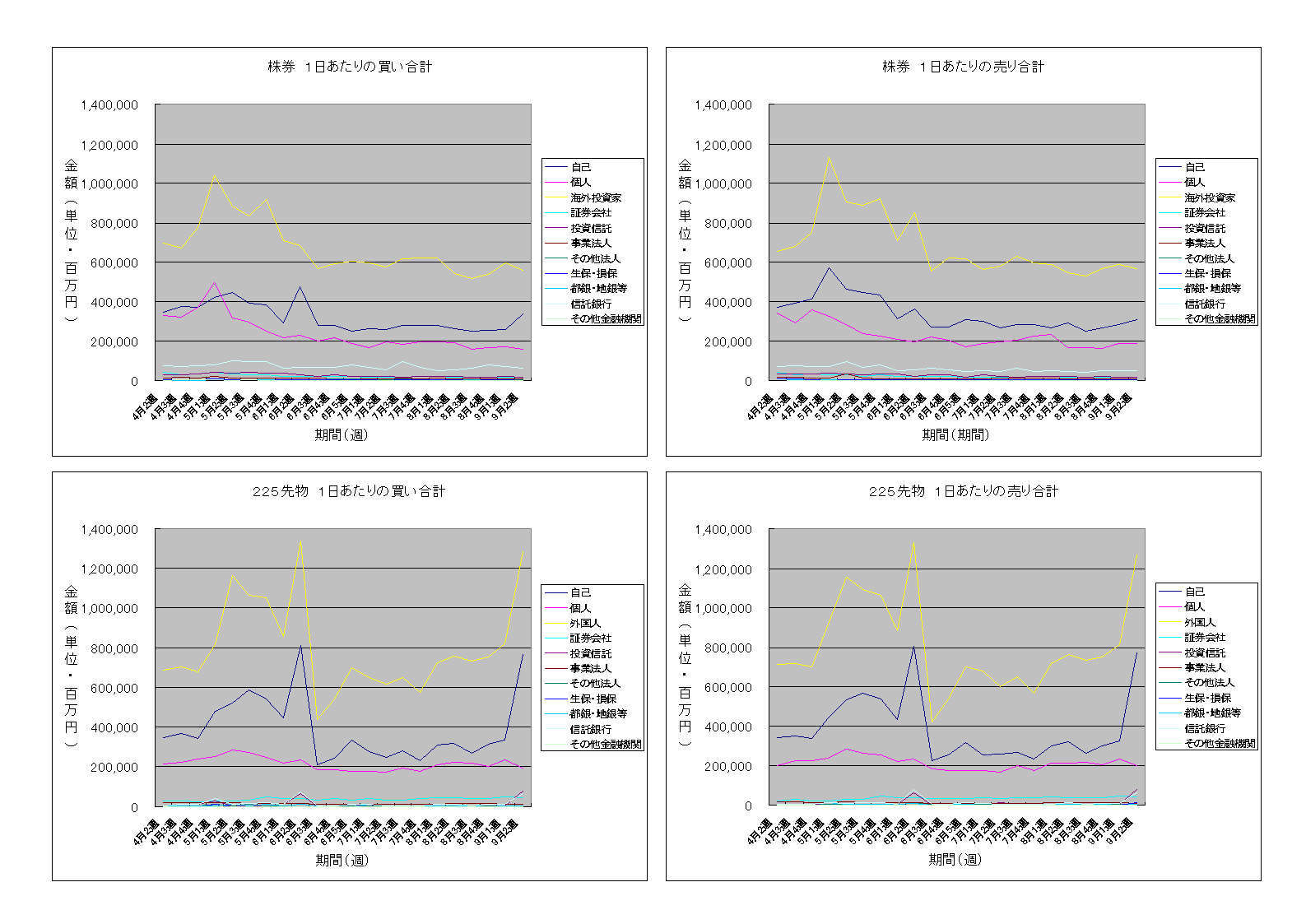 2010/09/20 - フォーナインさんの株式ブログ。タイトル:「投資部門別売買動向-14」 本文:先物の売買金額が急増したのはメジャーSQだったからということで、特筆することはなさそうです。