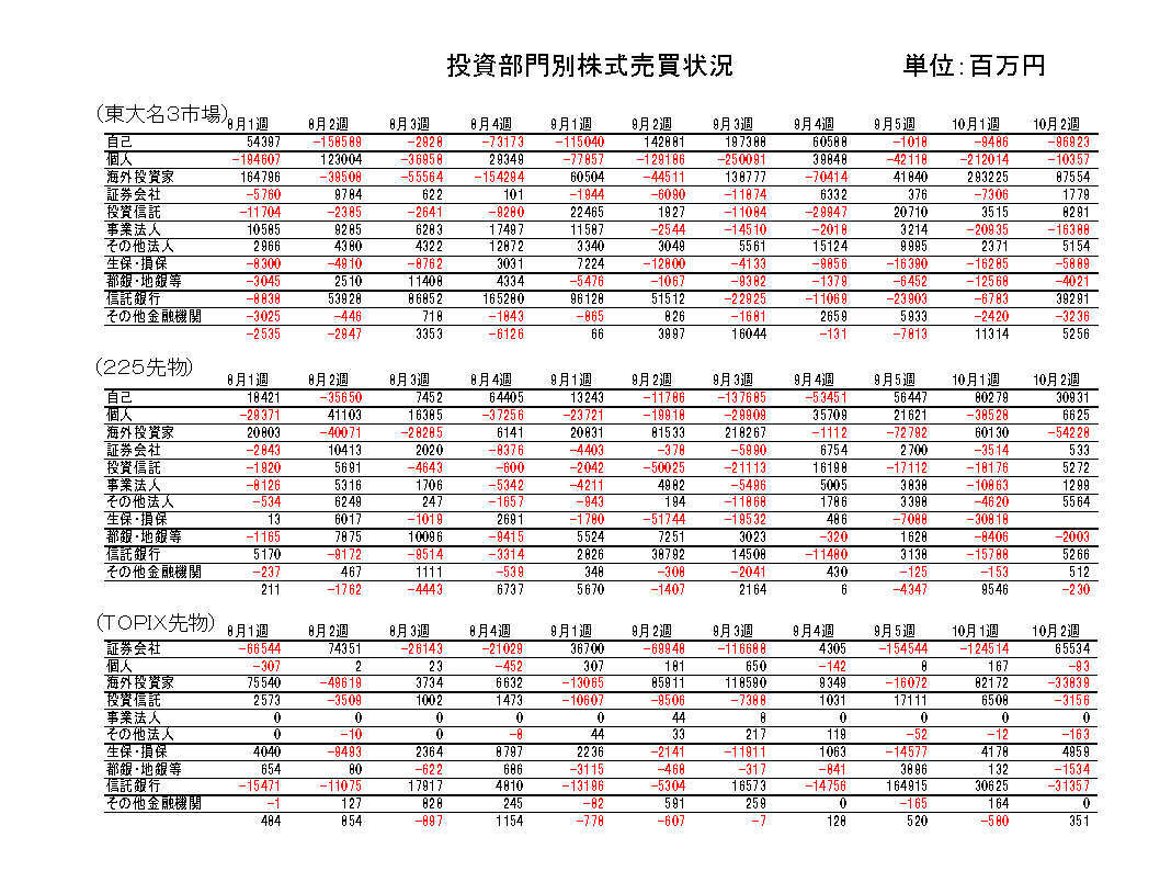 個人は売り越し継続。先物は225買い越し転換、TOPIX売り越し転換。