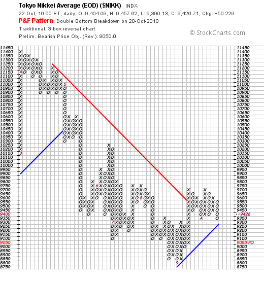 2010/10/24 - Newジェントルマンさんの株式ブログ。タイトル:「NKの目標値は9050円?」 本文:信頼性の高いP&Fで、NKの目標値は9050となっている。 ここまで下がると逆三尊底となるが・・・ GSの手口をみると一時的に下げることを示唆している。