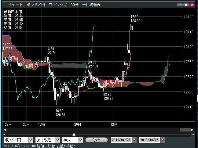 2010/10/26 - うおうおさんの株式ブログ。タイトル:「ポンド円が上昇してるなぁ」 本文:なんかよくわからんドル円上昇と英GDPが予想よりよかったおかげでポンド円が急上昇してるなぁ。 おかげで昨日仕掛けたポンド円ショートが死にました・・・ 昨日折角取れたのになぁ