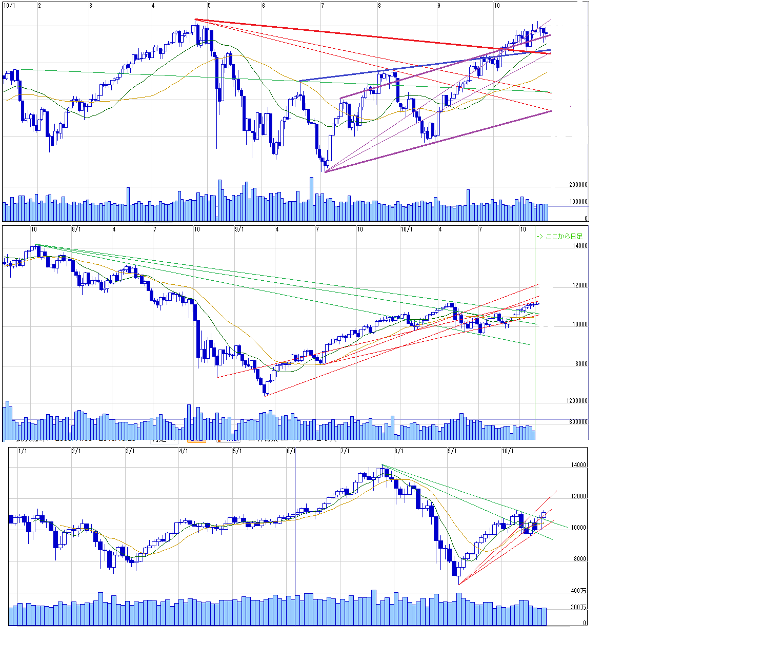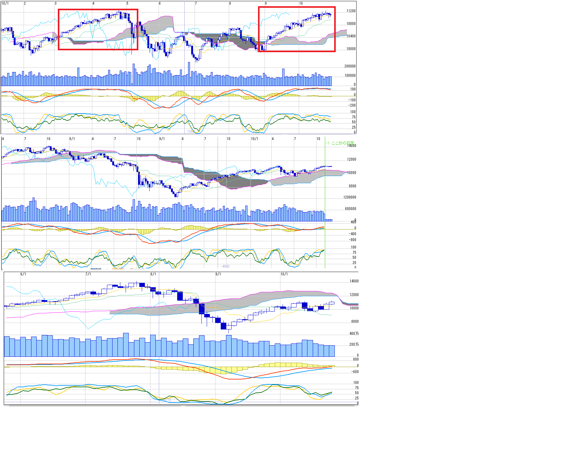 2010/10/30 - 月とスッポンさんの株式ブログ。タイトル:「11/1~ 来週のチャートポイント③ダウ」 本文:1、ダウトレンドライン、ファンライン 2、ボリバン、CPC,ブルベアレシオ 3、一目 ①②はこちら http://minkabu.jp/blog/show/284455