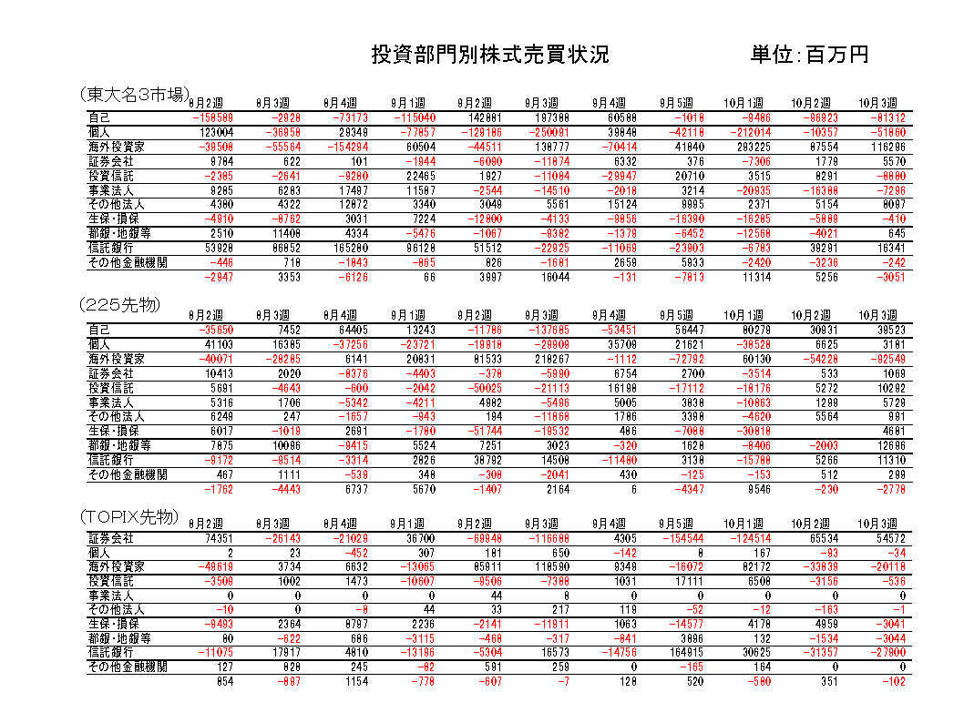 2010/11/01 - フォーナインさんの株式ブログ。タイトル:「投資部門別株式売買状況-32」 本文:直近の週の分を追加しました。 都銀・地銀等は買い越し転換。先物は225買い越し転換、TOPIX売り越し継続。 信託銀行は買い越し継続。先物は225買い越し継続、TOPIX売り越し継続。