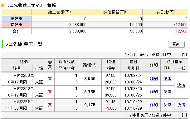 2010/11/01 - ちきんトレーダーさんの株式ブログ。タイトル:「動かないなぁ~」 本文:先週末に大きく下げたのに、リバウンドの気配なし…。 久しぶりに日経225miniに含み損が発生しました。 リバウンド狙いの逆張りなので、失敗色濃厚です。 年内10000円回復は無理かなぁ~。