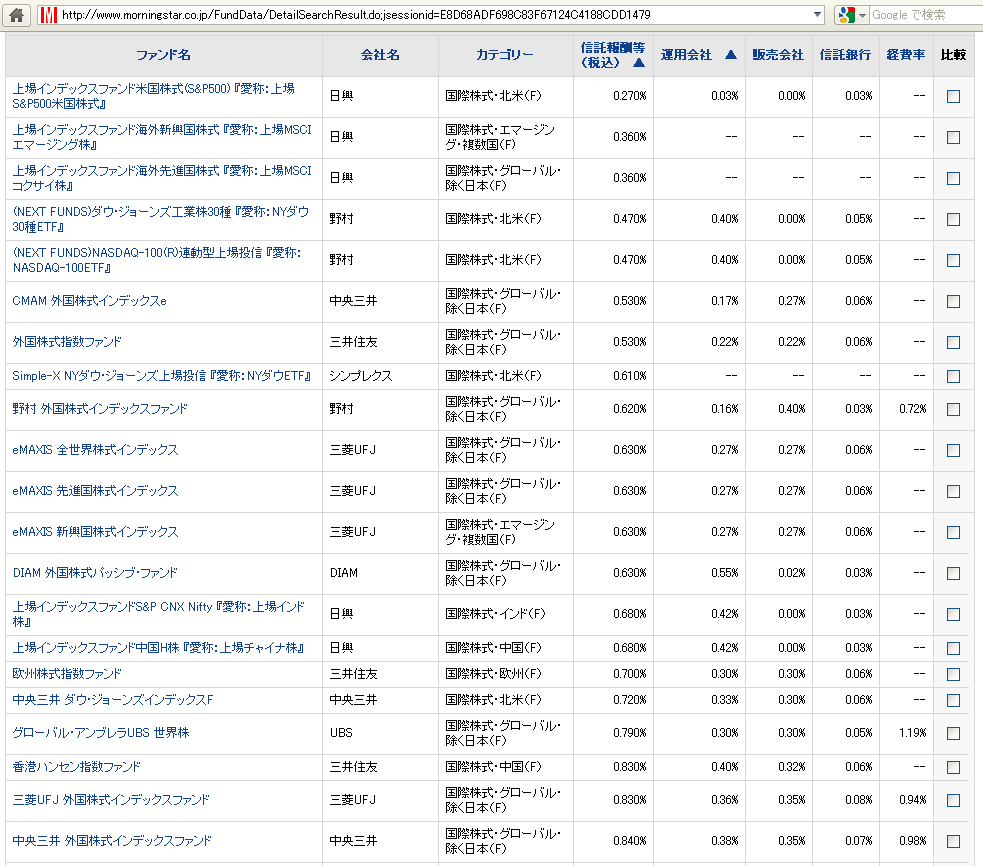 2010/11/02 - miyakenさんの株式ブログ。タイトル:「国際株式型のインデックスファンドをコスト順に並べると」 本文:モーニングスターでファンド検索がパワーアップしました。 http://www.morningstar.co.jp/FundData/DetailSearch.do