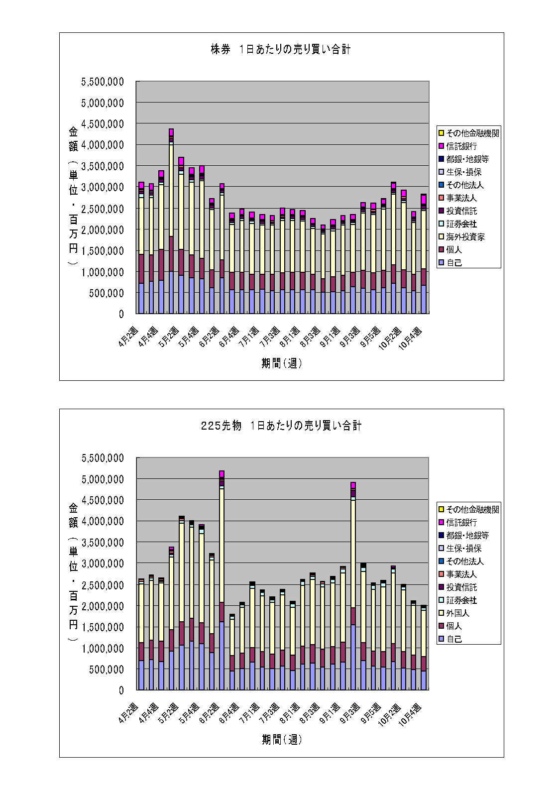2010/11/05 - フォーナインさんの株式ブログ。タイトル:「投資部門別売買動向-21」 本文:株券の売買金額はやや回復となりましたが、先物の低水準のままです。