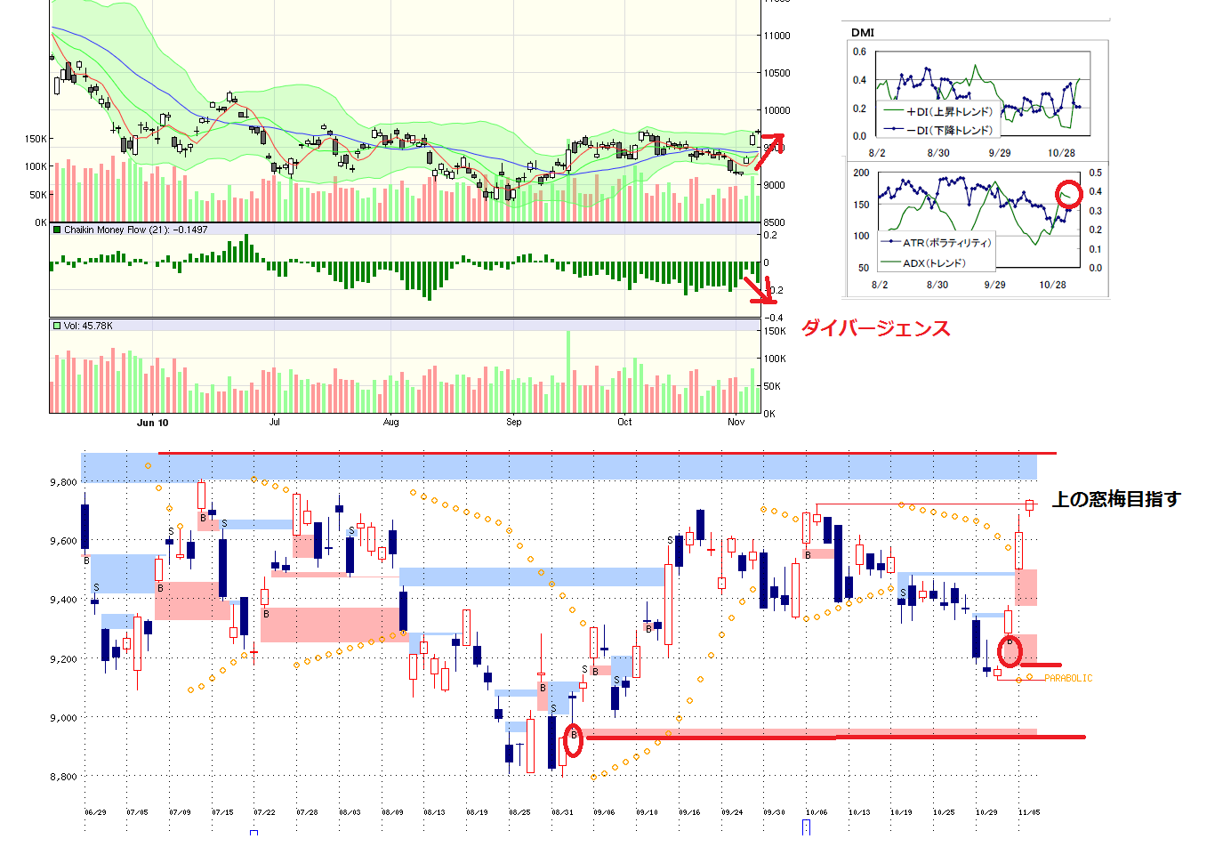 2010/11/08 - 月とスッポンさんの株式ブログ。タイトル:「11/8 本日のチャート①」 本文:1、MP 2、先週のMP 3、CMF,DMI,窓