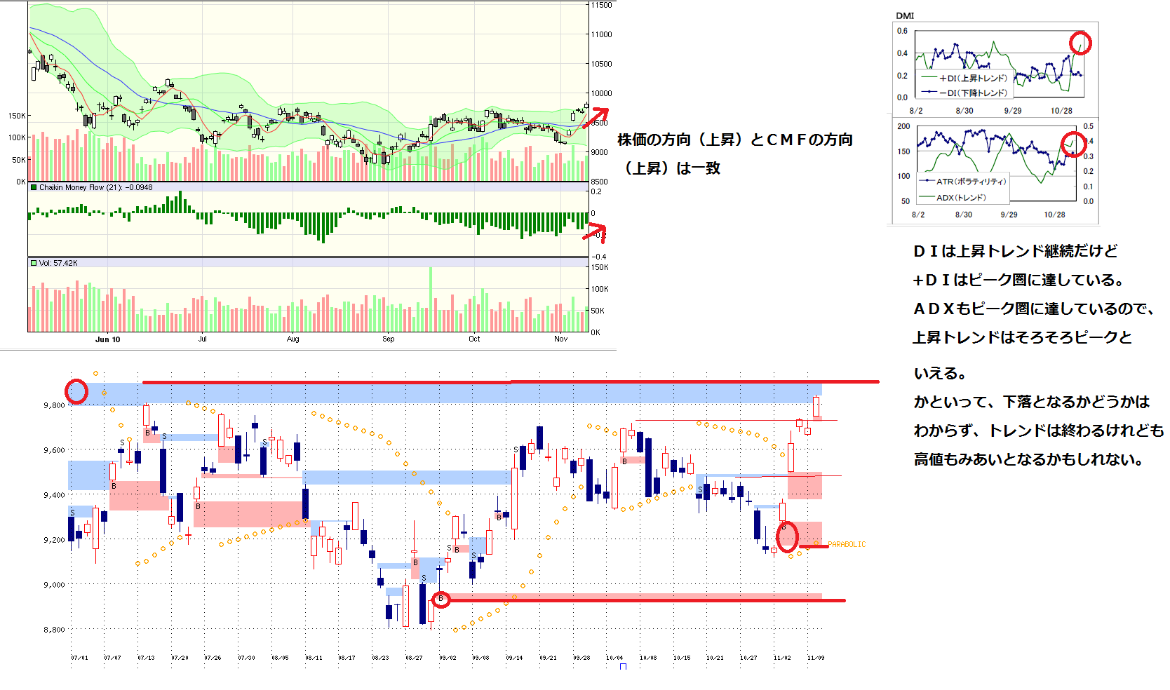 2010/11/10 - 月とスッポンさんの株式ブログ。タイトル:「11/10 本日のチャート①」 本文:遅くなりましたので今日は簡単に 1.MP 2、先週のMP 3、cmf、DMI,窓