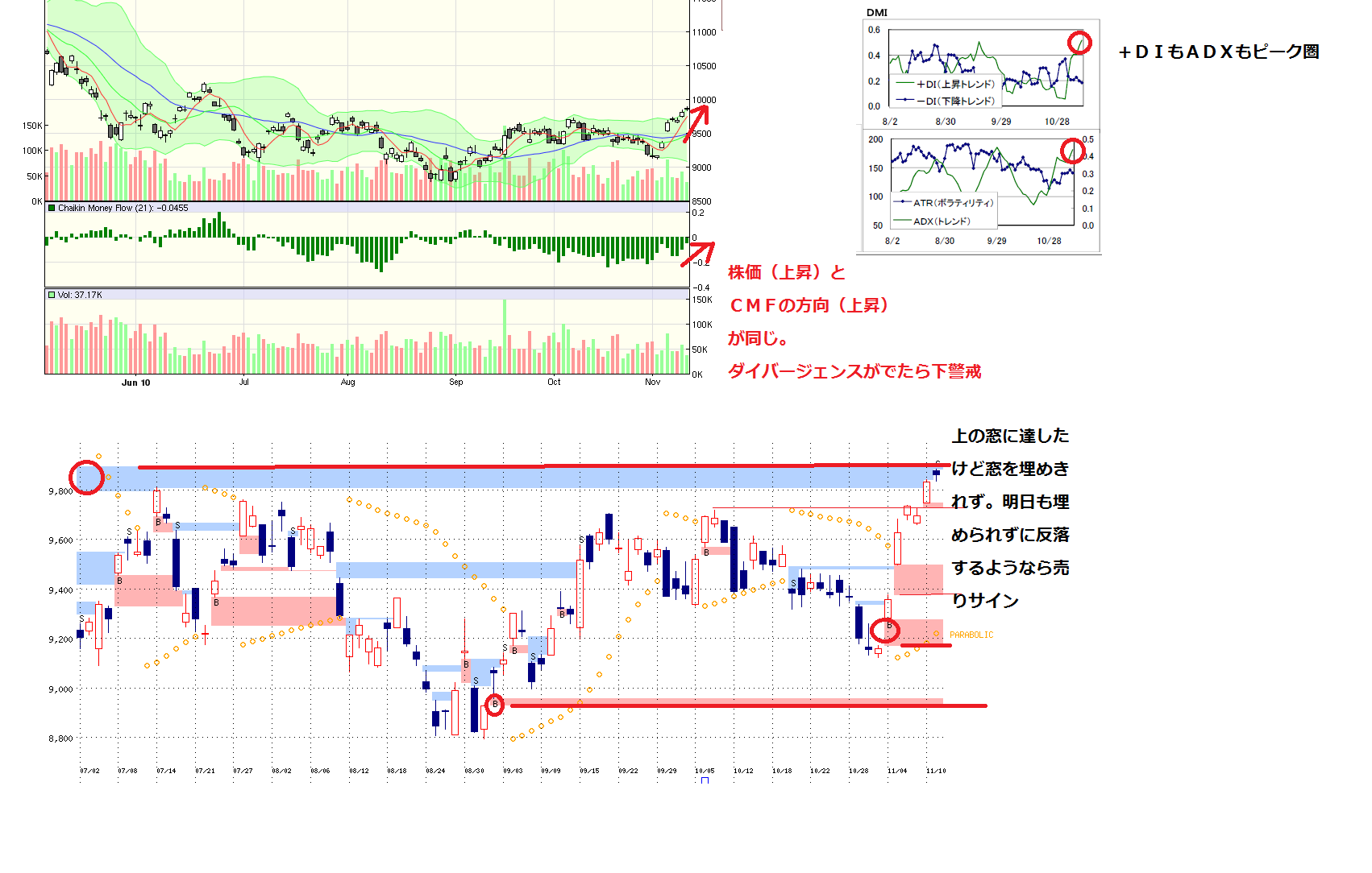 2010/11/11 - 月とスッポンさんの株式ブログ。タイトル:「11/11 本日のチャート①」 本文:1、MP 引き続き、レッジ9750に注目 2、先週のMP 3.cmf、DMI,窓 →CMFは問題なし、