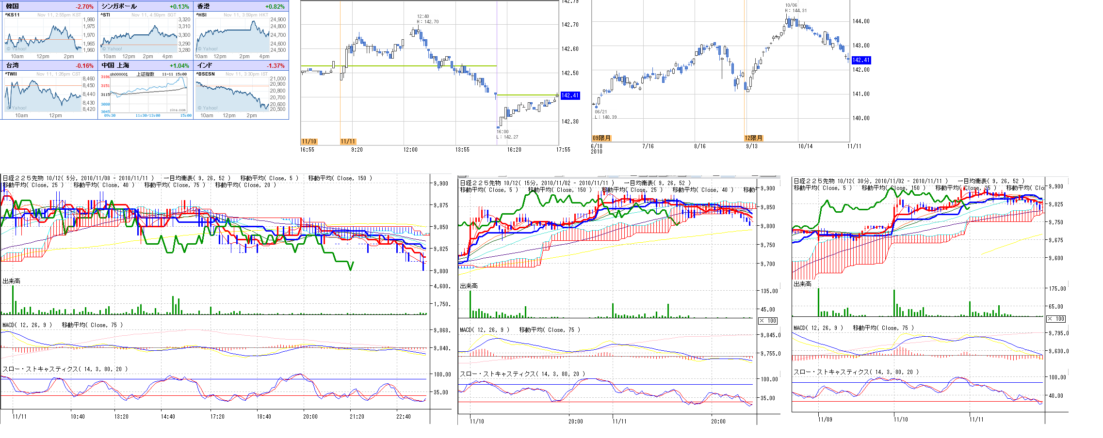 2010/11/11 - 月とスッポンさんの株式ブログ。タイトル:「11/11 本日のチャート②」 本文:画像 分足と債券の記録(夕場終了後にアップ) ☆ニュース ・注目される日米金融緩和合戦の行くえ