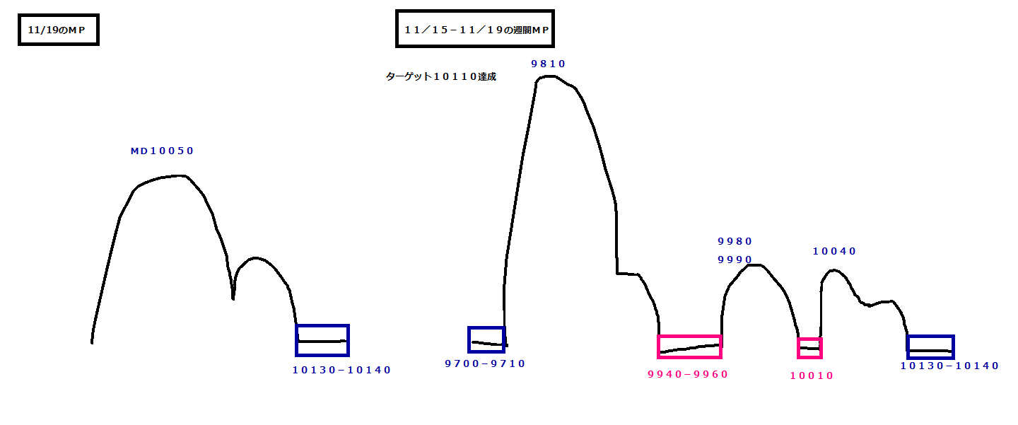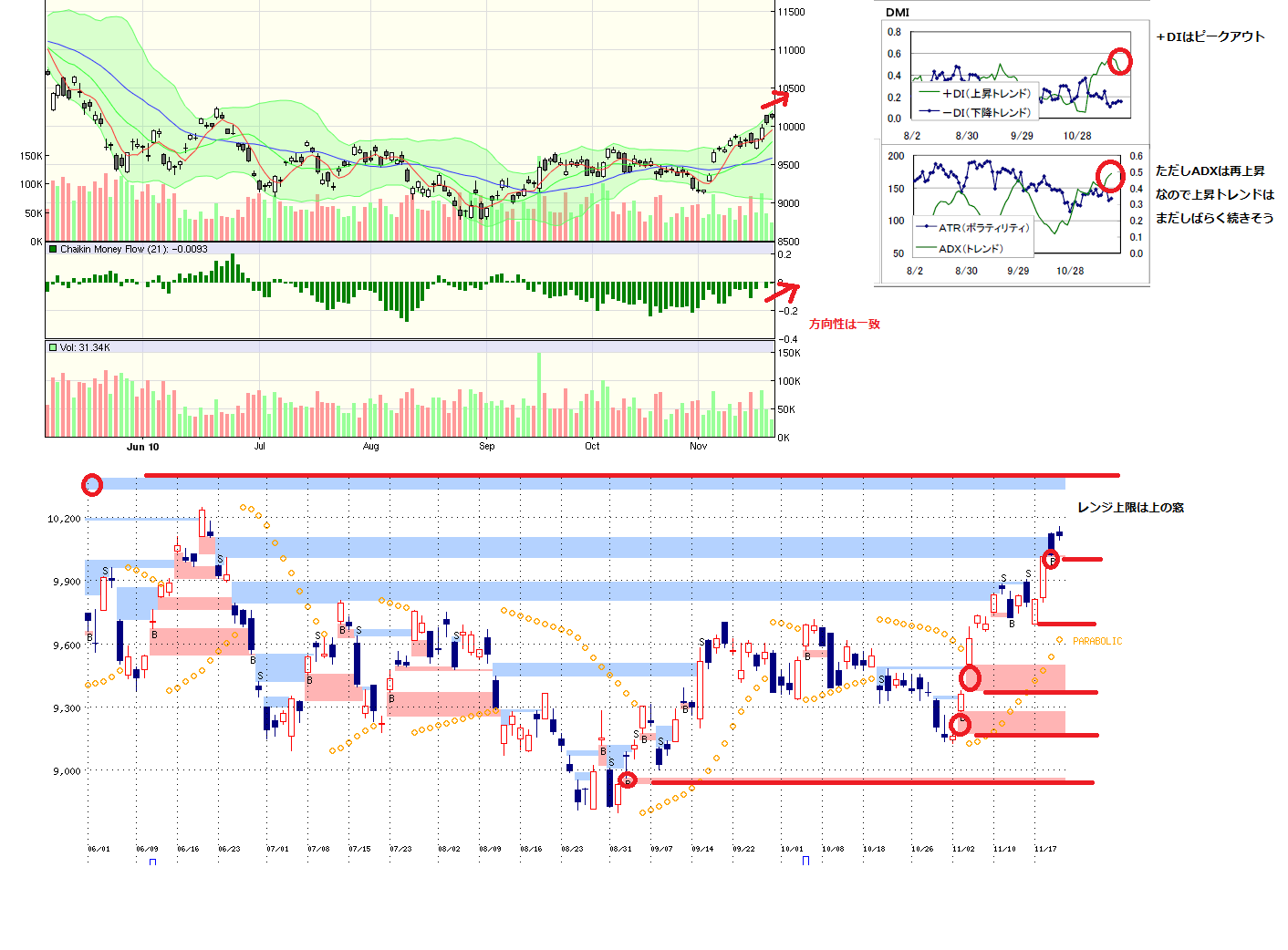 2010/11/22 - 月とスッポンさんの株式ブログ。タイトル:「11/22 本日のチャート①」 本文:1、MP 2、先週のMP 3.cmf、DMI,窓
