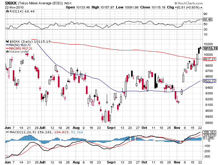 2010/11/23 - Newジェントルマンさんの株式ブログ。タイトル:「ダブルで付いたブラックキャンドル」 本文:NKのチャートに11/19,22と連ちゃんでブラックキャンドルが出た。 かなり怪しくなってきているが、一度一万円前後まで押し目を入れ、ここで買いを呼び込んだ後落とすのかも知れない。