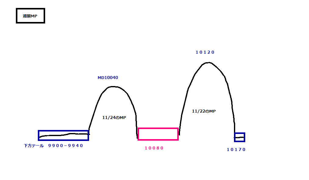 2010/11/24 - 月とスッポンさんの株式ブログ。タイトル:「11/24 本日のチャート①」 本文:1.本日のMP 2、先週のMP →レッジを全てうめてしまいました。 下値は軽くなってしまった感じです。 でも、9810の山があるので、ここでは支えられそうです。