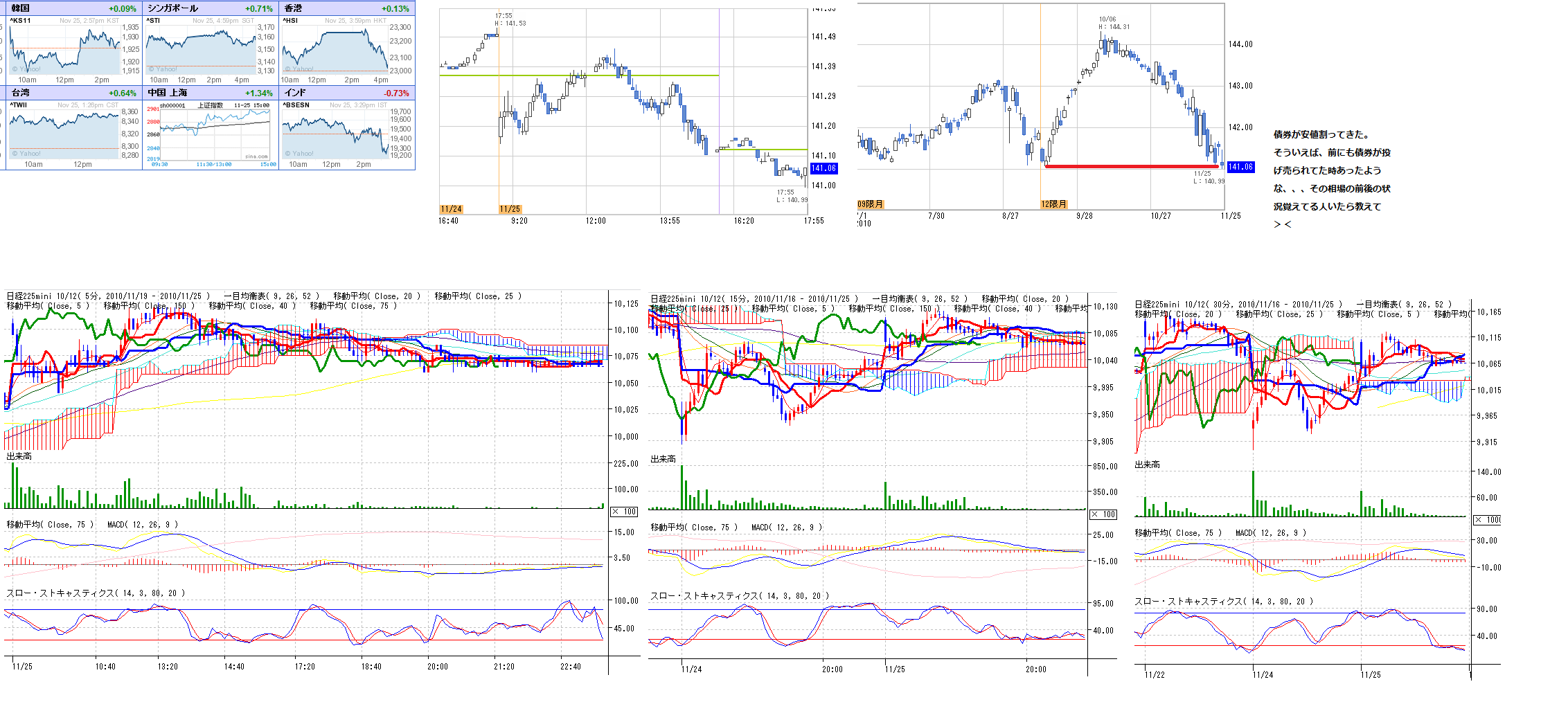 2010/11/25 - 月とスッポンさんの株式ブログ。タイトル:「11/25 本日のチャート②」 本文:画像 分足と債券の記録 ☆相場の整理をしてみると 需給要因 ・信用買い残減少→上値のしこりは少なくなってる ・裁定残増加→4月のピーク圏にちかづきつつあるので、裁定解消売りに注意