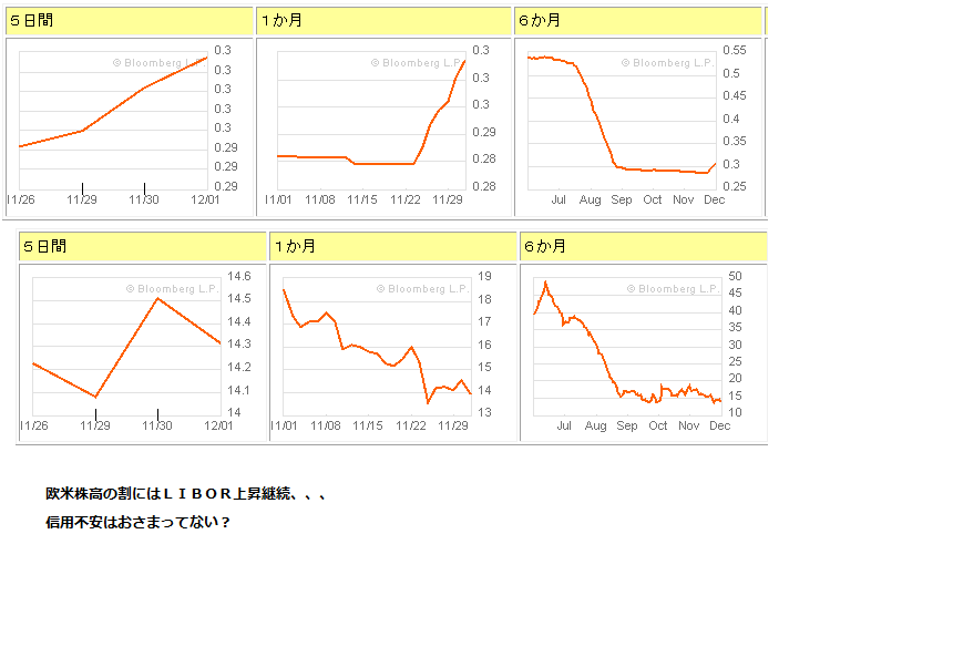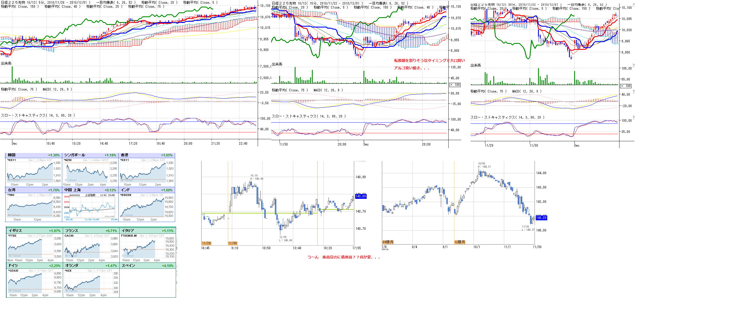 2010/12/01 - 月とスッポンさんの株式ブログ。タイトル:「12/1 本日のチャート②」 本文:画像1 分足と債券の記録 画像2 リスク指標の監視再開 ☆ニュース ・EU,厳格なストレステストを計画