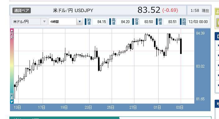 83.5円は軸というよりも底になっているようなので、今日の発表で来週で84円、そのまま85円に手が届いた状態で年を越したいですね。