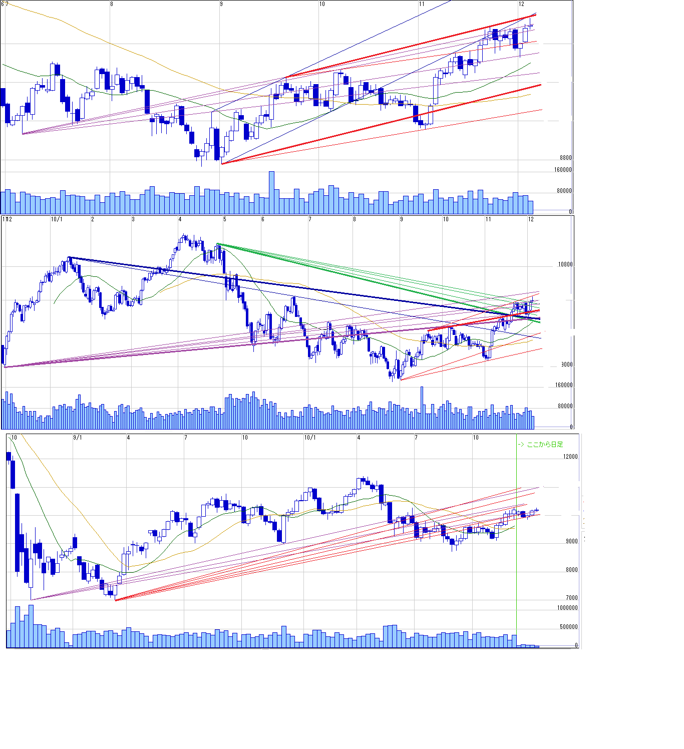 2010/12/04 - 月とスッポンさんの株式ブログ。タイトル:「12/6~ 来週のチャートポイント①」 本文:1~3 日経先物 ☆計算値、上値めど、下値めどは明日追記します。
