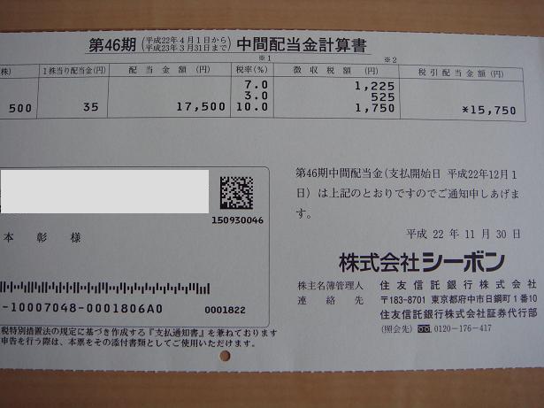 2010/12/05 - 坂本彰さんの株式ブログ。タイトル:「シーボン 4926 配当金」 本文:シーボン 4926 から配当金が届きました。 1株35円で合計15,750円でした。 本決算時の配当はさらに高く、保有銘柄の中では 最も配当率が高いです。