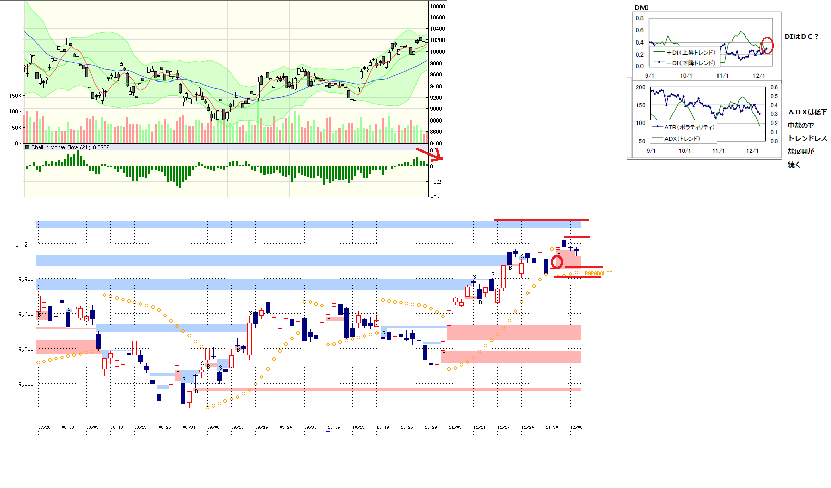 2010/12/07 - 月とスッポンさんの株式ブログ。タイトル:「12/7 本日のチャート①」 本文:1、MP 2、先週のMP 3.CMF,DMI,窓 ☆相場雑感 MSQという事で↑↓ふってきますね~ 最後の悪あがき?