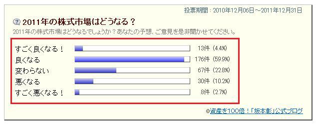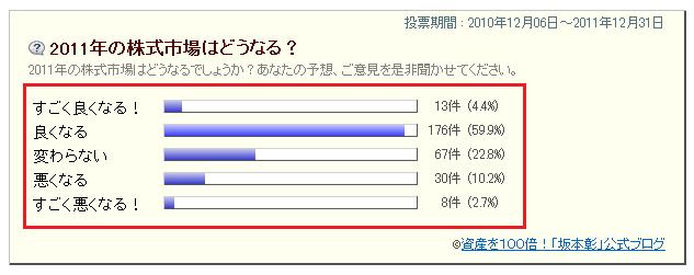 2010/12/16 - 坂本彰さんの株式ブログ。タイトル:「市場は良くなる 全体の64%」 本文:先週実施したアンケート「2011年の株式市場はどうなる?」 ですが、なんと1週間で300件近い回答をいただきました。 こんなにもたくさんの意見をいただけると思っても
