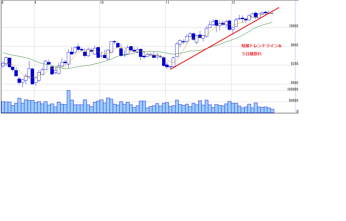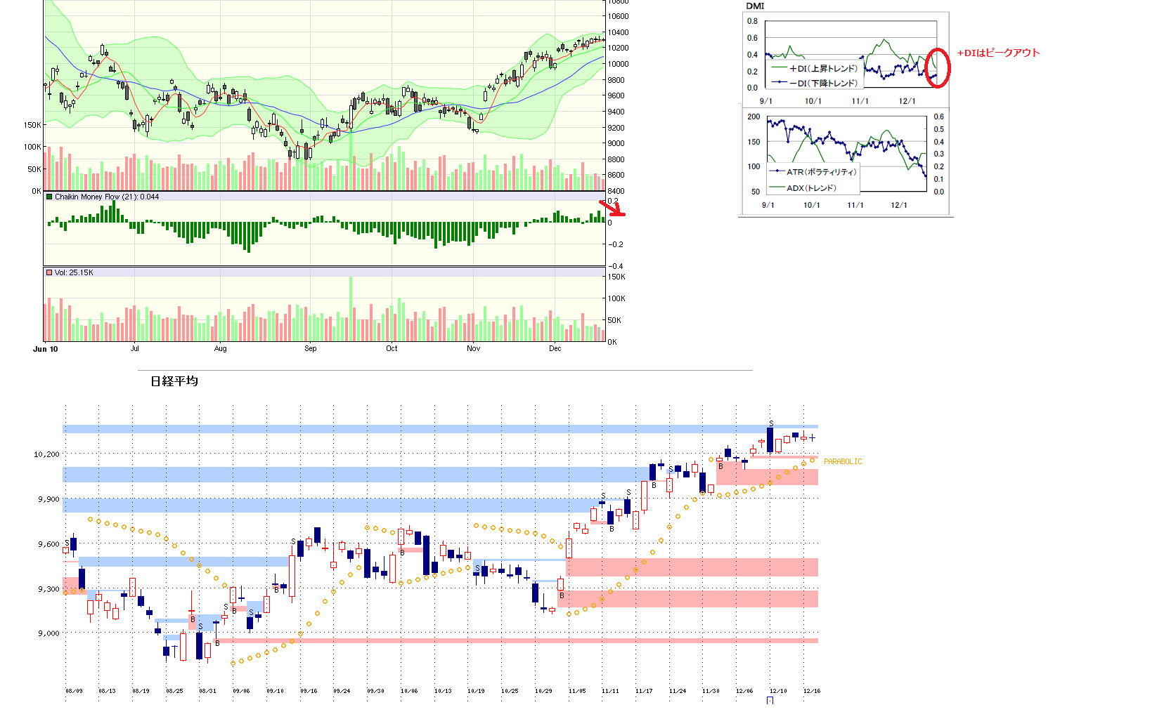2010/12/17 - 月とスッポンさんの株式ブログ。タイトル:「12/17 本日のチャート①」 本文:1、MP 2、CMF,DMI,窓 3、短期トレンドライン&5日線割れ →流れが変わるか?