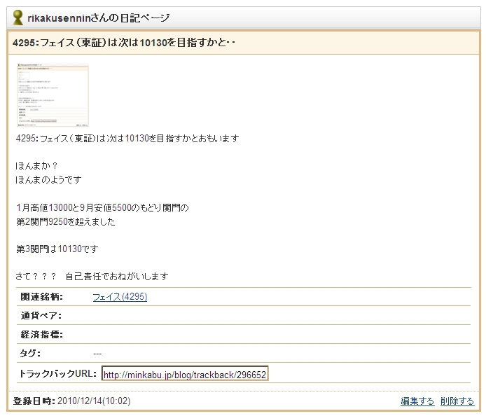 2010/12/19 - rikakusenninさんの株式ブログ。タイトル:「4295:フェイス(東証)は美味しかったでしょう!!」 本文:12/14の日記で、 4295:フェイス(東証)は次は10130を目指すかとおもいます ほんまか? ほんまのようです 1月高値13000と9月安値5500のもどり関門の