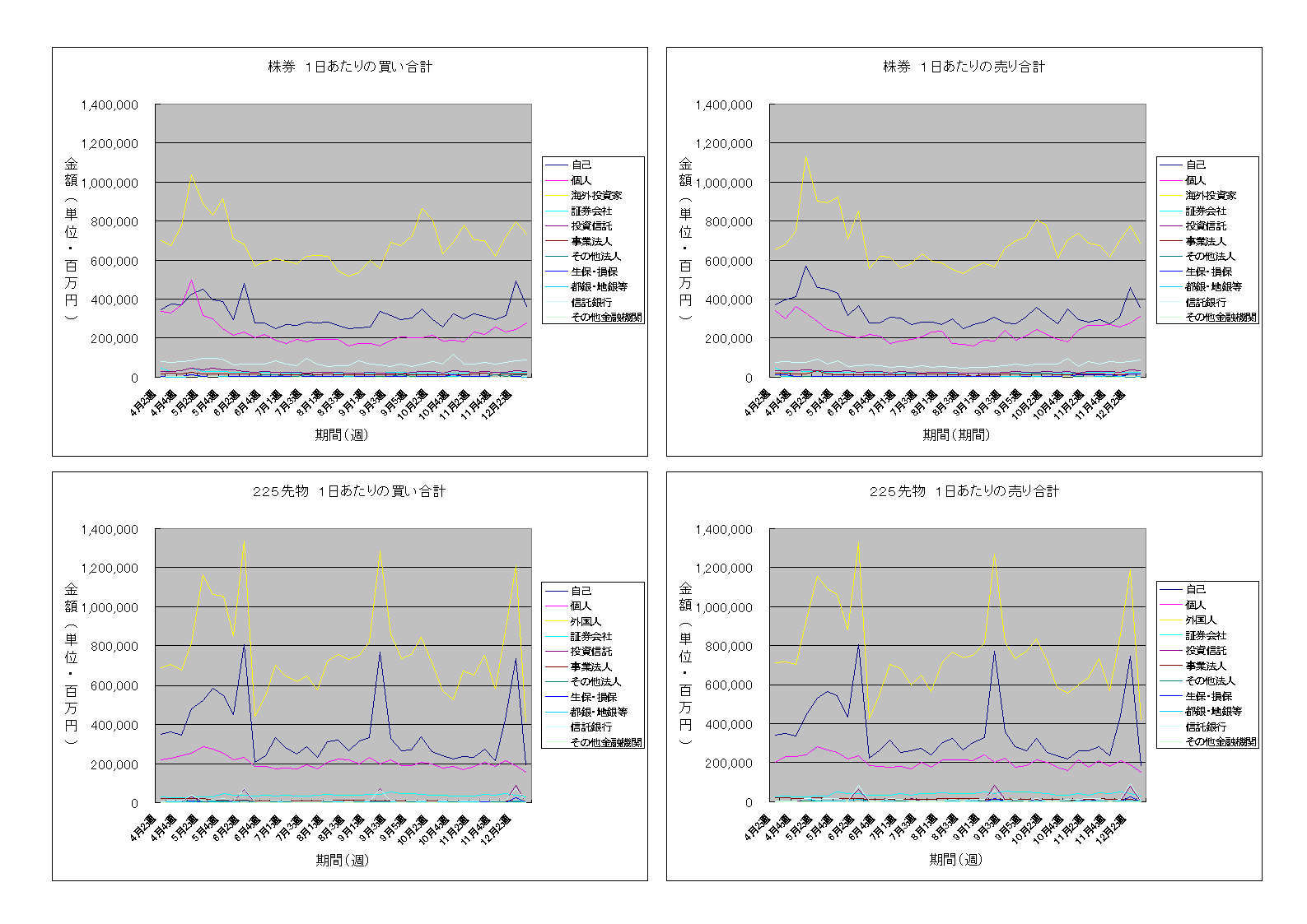 2010/12/30 - フォーナインさんの株式ブログ。タイトル:「投資部門別売買動向-28」 本文:株券に関しては良い感じに売買金額が回復しましたが、先物に関しては今年一番の低水準と思われます。 海外投資家が225先物を売り越しましたが、この低水準では参考にならないと思われます。