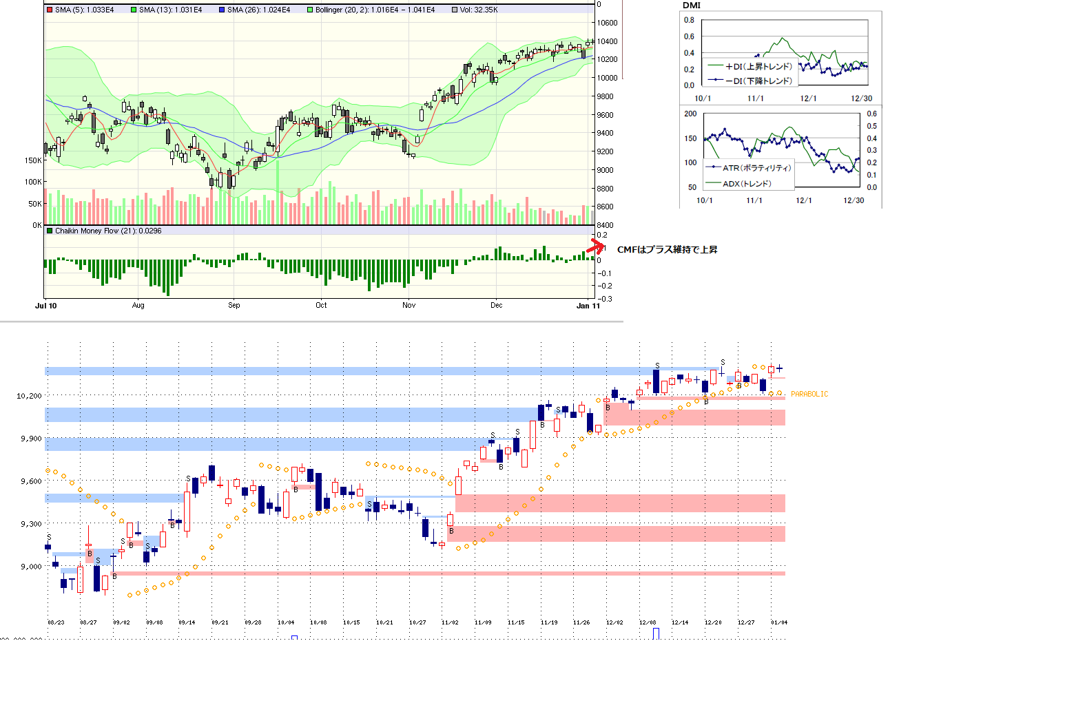 2011/01/05 - 月とスッポンさんの株式ブログ。タイトル:「1/5 本日のチャート①」 本文:1、MP 2.先週のMP 3.CMF,DMI,窓 ☆相場雑感 ・CTAの債券先物アービトラージでのドテン売買が続いてるっぽい。。。 ・商品市場急落は気になる、、、