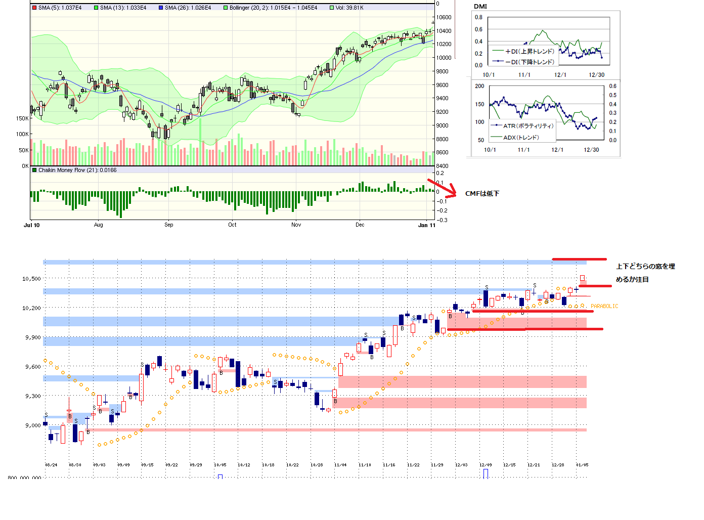 2011/01/06 - 月とスッポンさんの株式ブログ。タイトル:「1/6 本日のチャート①」 本文:1、MP ダブルディストリでレンジ切り上げ 2.先週の週間MP 3、CMF.DMI,窓 ☆相場雑感