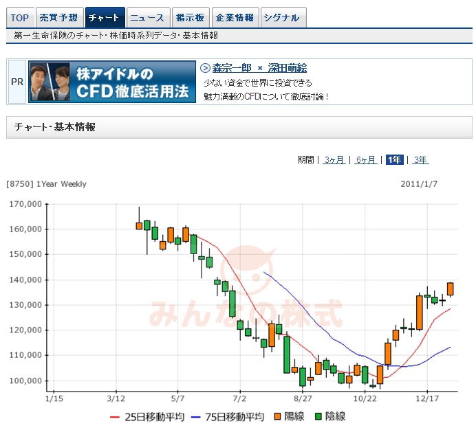 2011/01/08 - rikakusenninさんの株式ブログ。タイトル:「8750:第一生命の月曜日はどうなるでしょうか??? 」 本文:8750:第一生命の月曜日はどうなるでしょうか??? 昨日の金曜日は、 安値134400、高値139100まであって、138600で終わりました 上げましたね